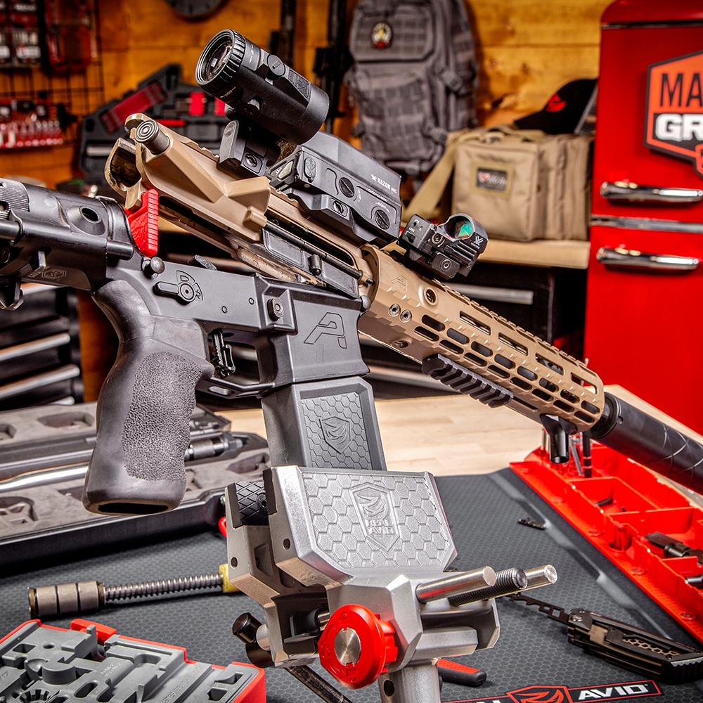 - Блокировка дюбелей для наложений Gun-Fit ™ (включенная) и ручка для монтажа камеры замка AR-15 Lug-Lok ™ (продается отдельно)