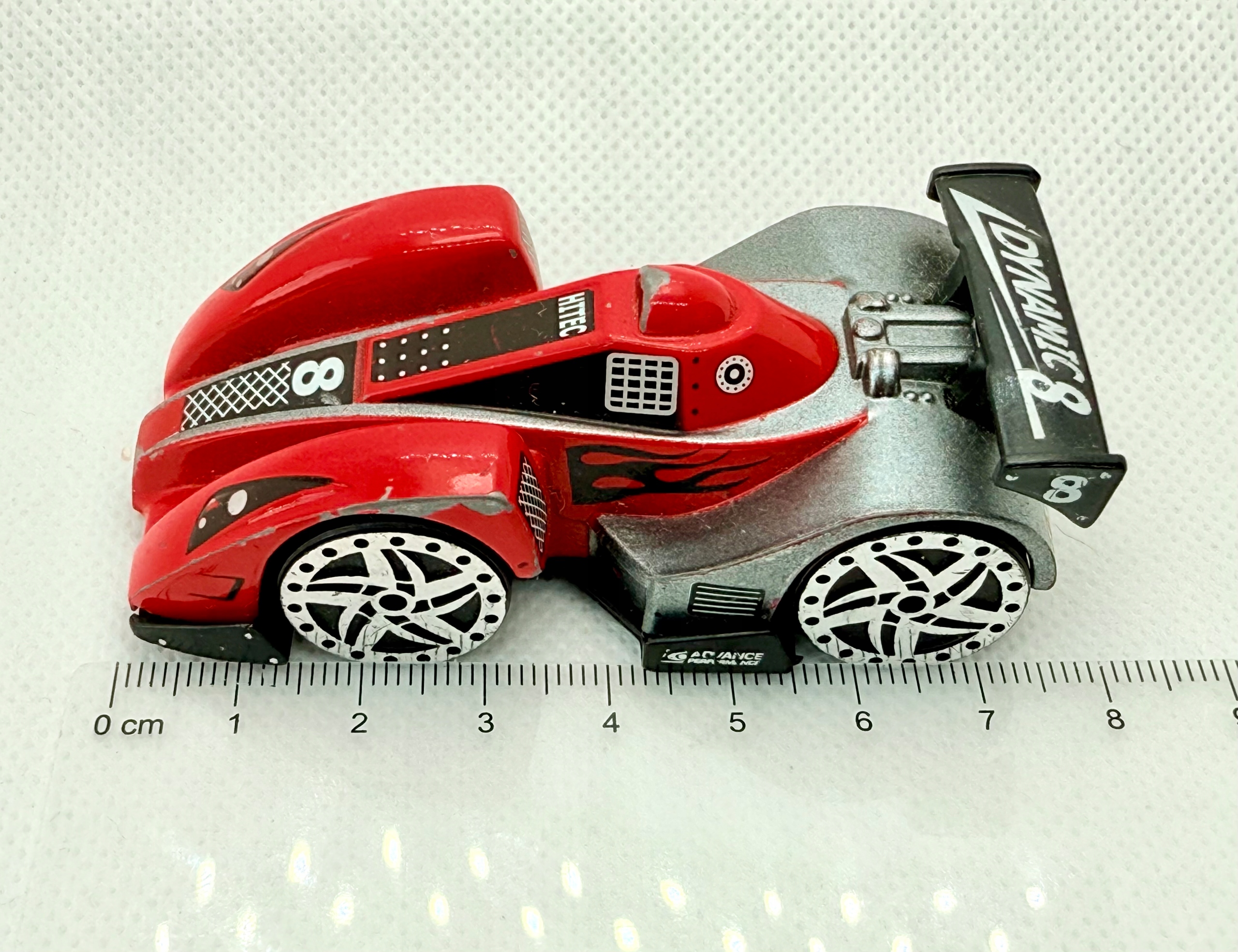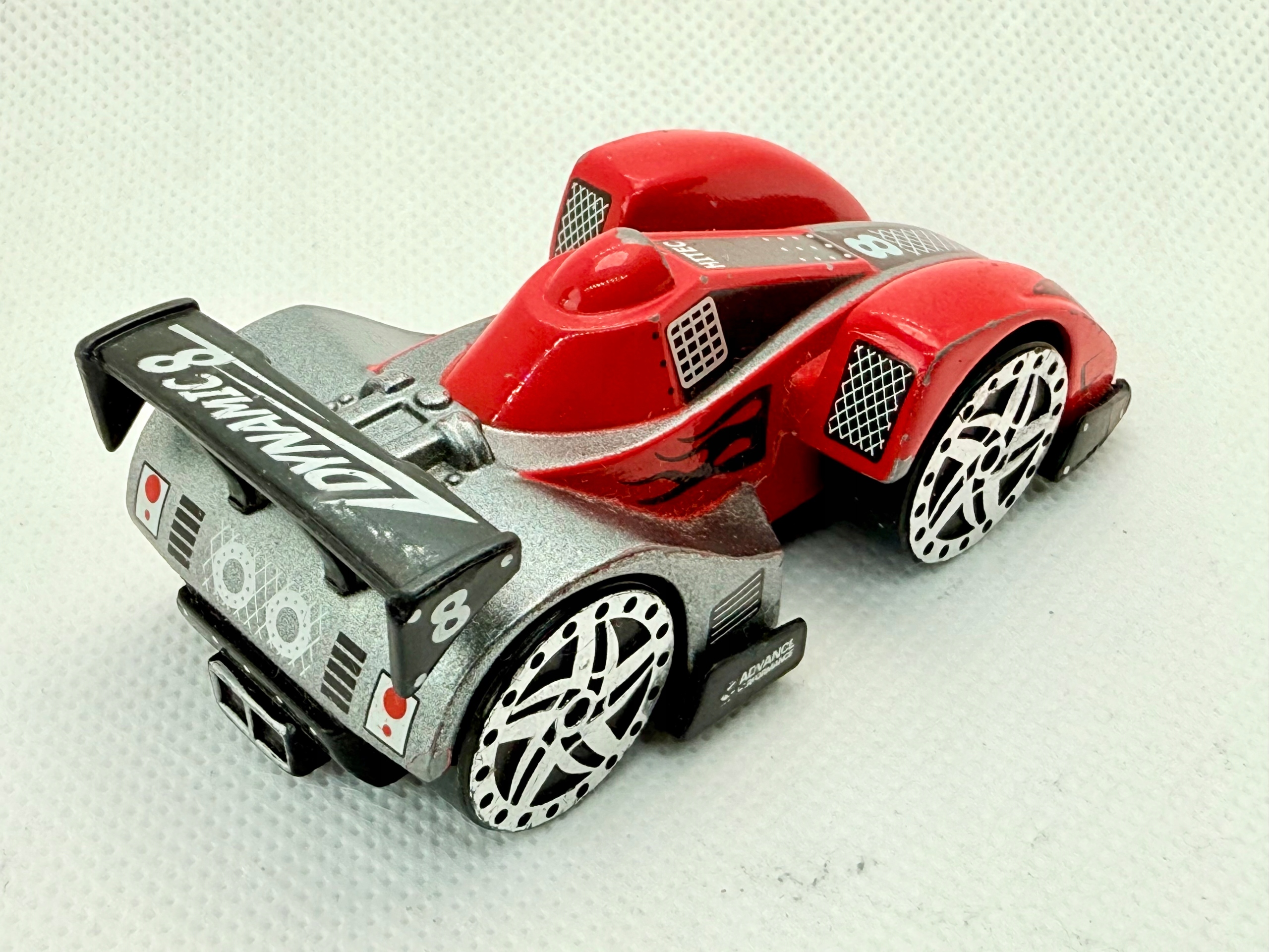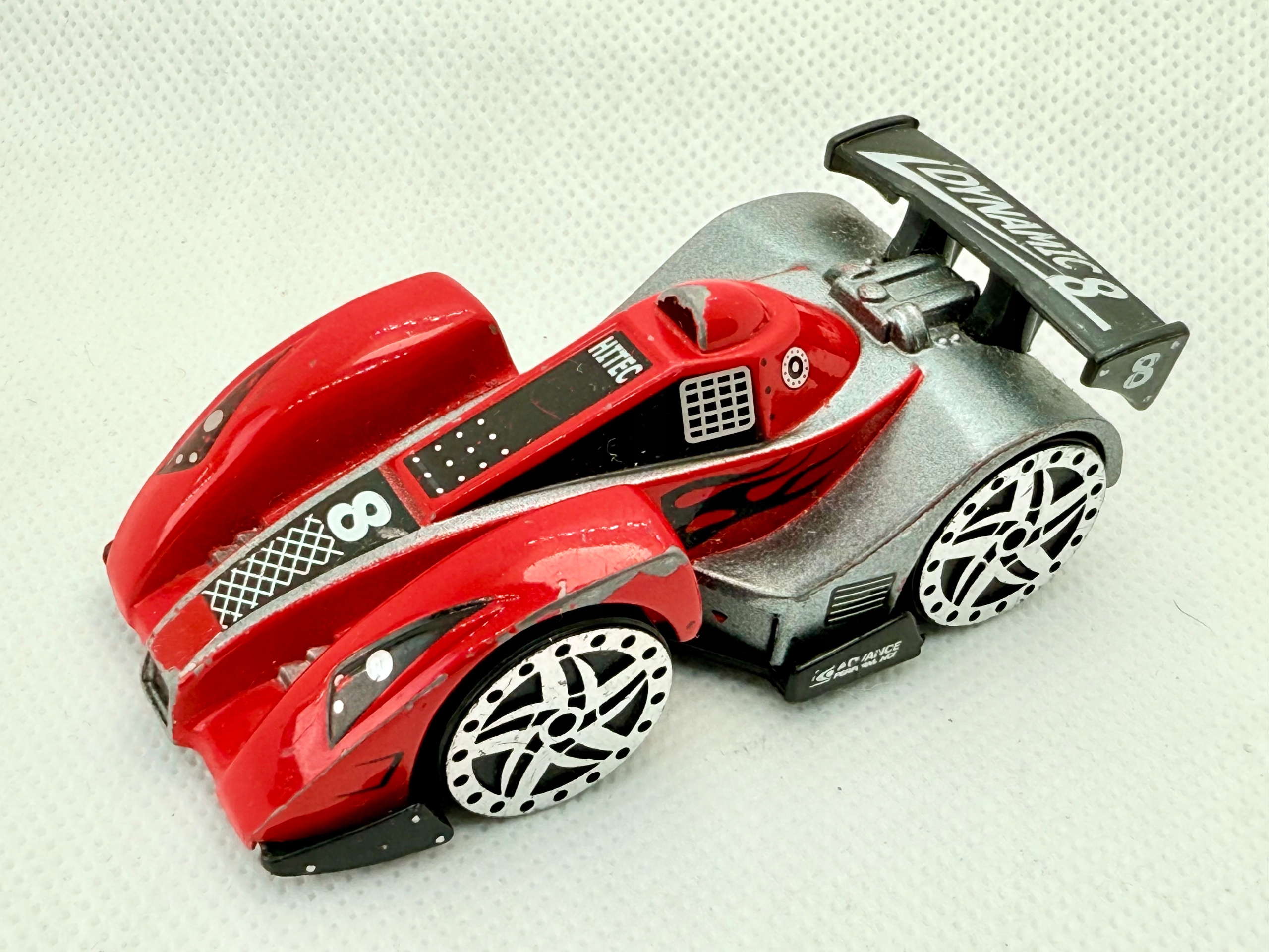 Предлагаю модель спортивного автомобиля Realtoy Dynamic 8 в масштабе 1:64. Транспортное средство из металла с пластиковым днищем и деталями. Автомобиль отличается агрессивным дизайном, гоночной окраской с изображением пламени и огромным спойлером с надписью «Dynamic 8». Это фантастическая модель, вдохновленная гонками на выносливость. Состояние описывается как б/у - на краске видны потертости, но все элементы на месте. Идеальный предмет для пополнения детской коллекции или в качестве предмета для тюнинга/кастомизации.