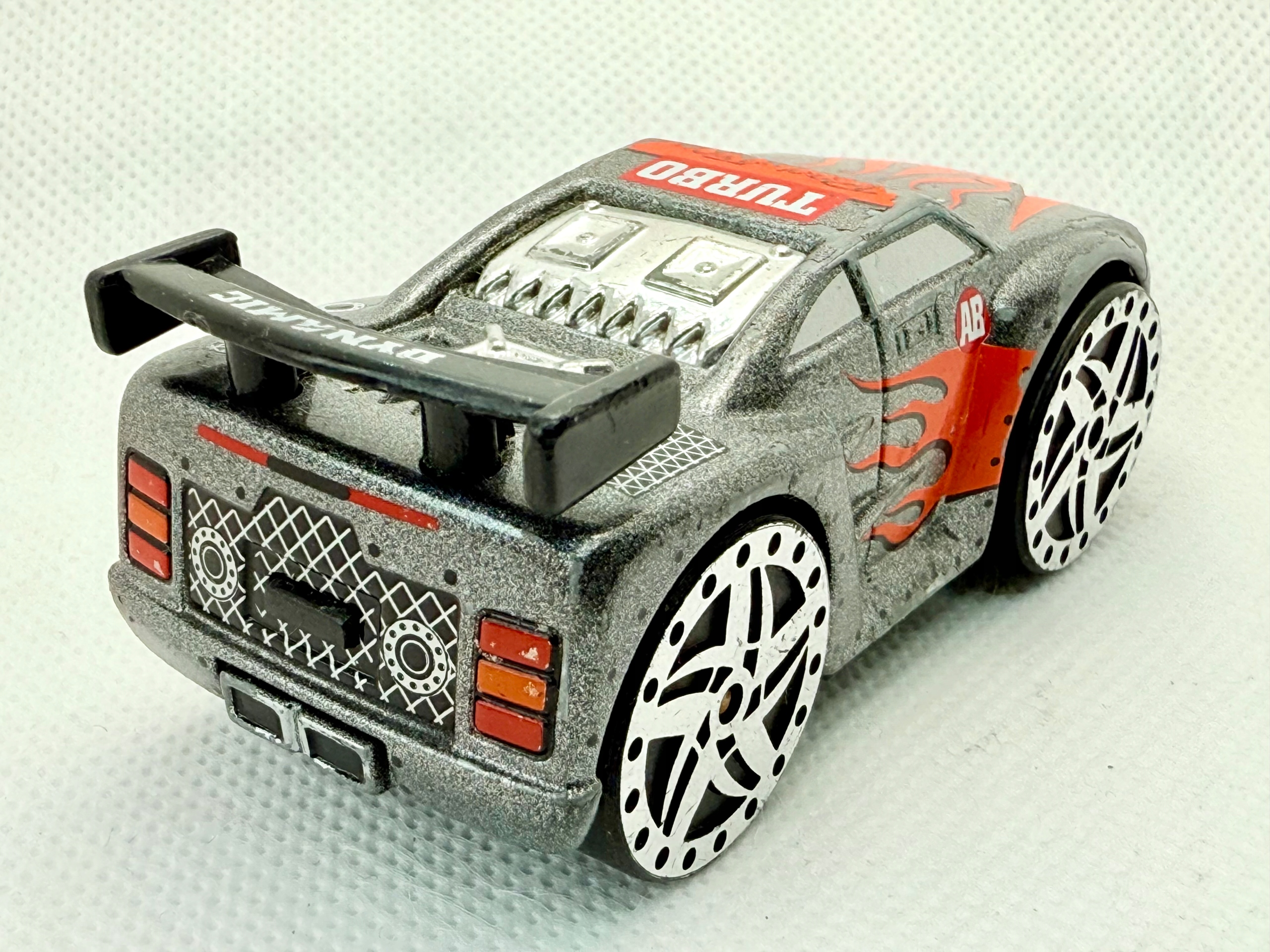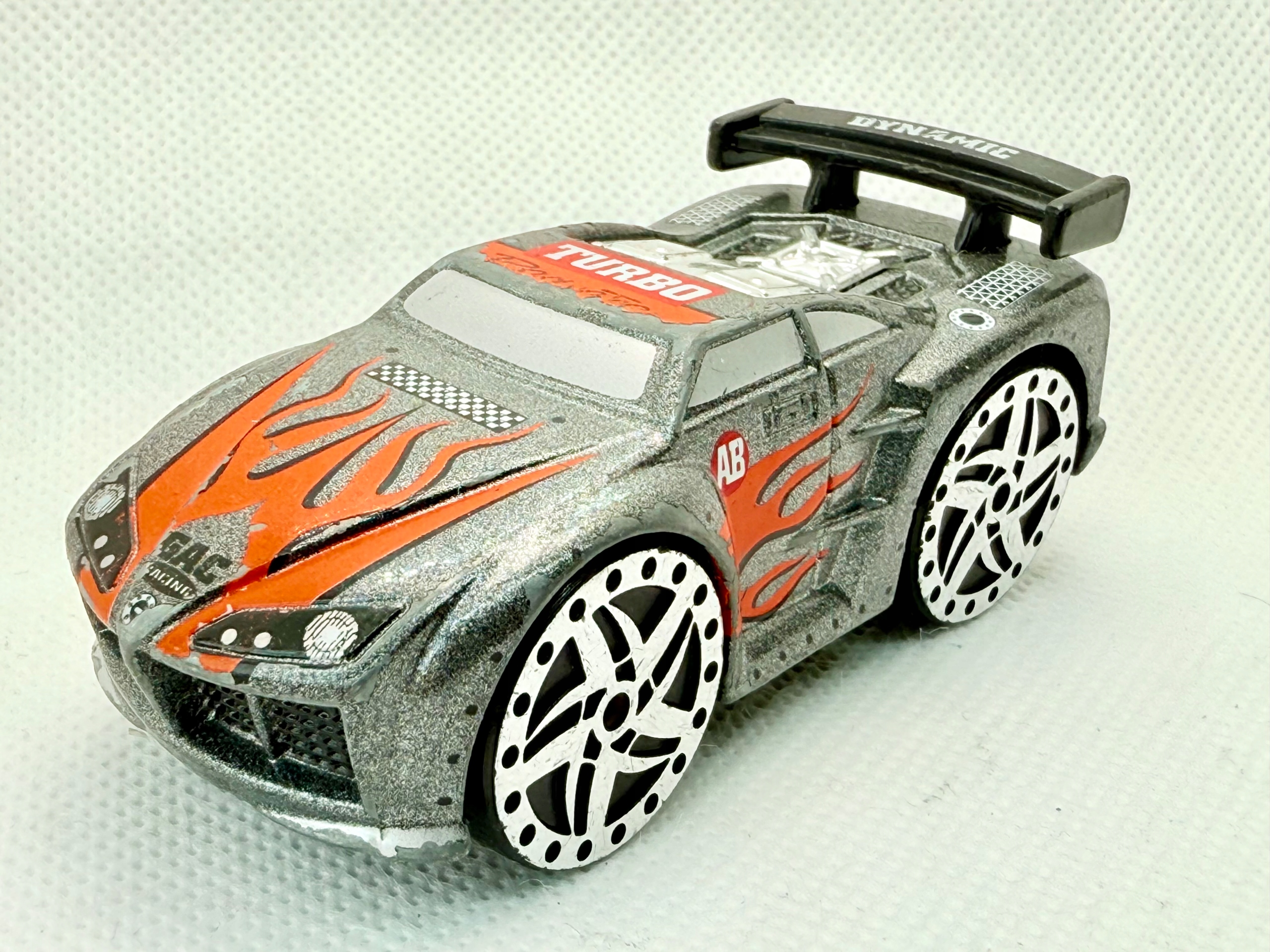 Спортивный турбо 1:64 от Welly. Серебряное тело, огненные узоры и огромный спойлер. Используется, но с характером - идеально подходит для гоночной коллекции!