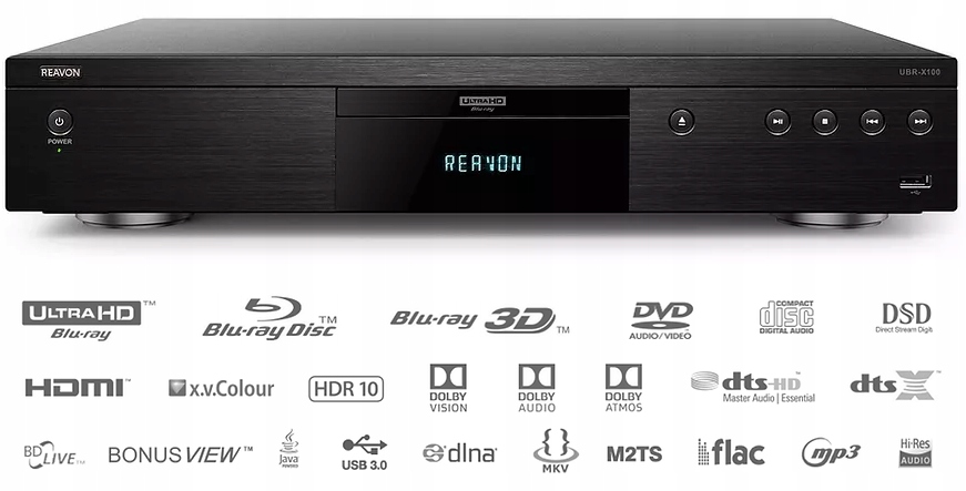 В настоящее время предложение REAVON включает две модели плееров: UBR-X100 (4K Blu-ray), UBR-X110, улучшенный по сравнению с " сотни" для воспроизведения SACD и их аудиофильский эквивалент UBR-X200 (4K Blu-ray). Все они совместимы с дисками Blu-ray 4K Ultra HD, HD 1080p и 3D Blu-ray, DVD и аудио компакт-дисками, а также воспроизводят аудио и видео (MKV, FLAC, DSD, AIFF, MP3, JPG) из файлов, хранящихся на внешних носителях. жесткие диски и флэш-накопители, они также работают с сетевыми дисками с протоколами DLNA/SMB (Samba).
