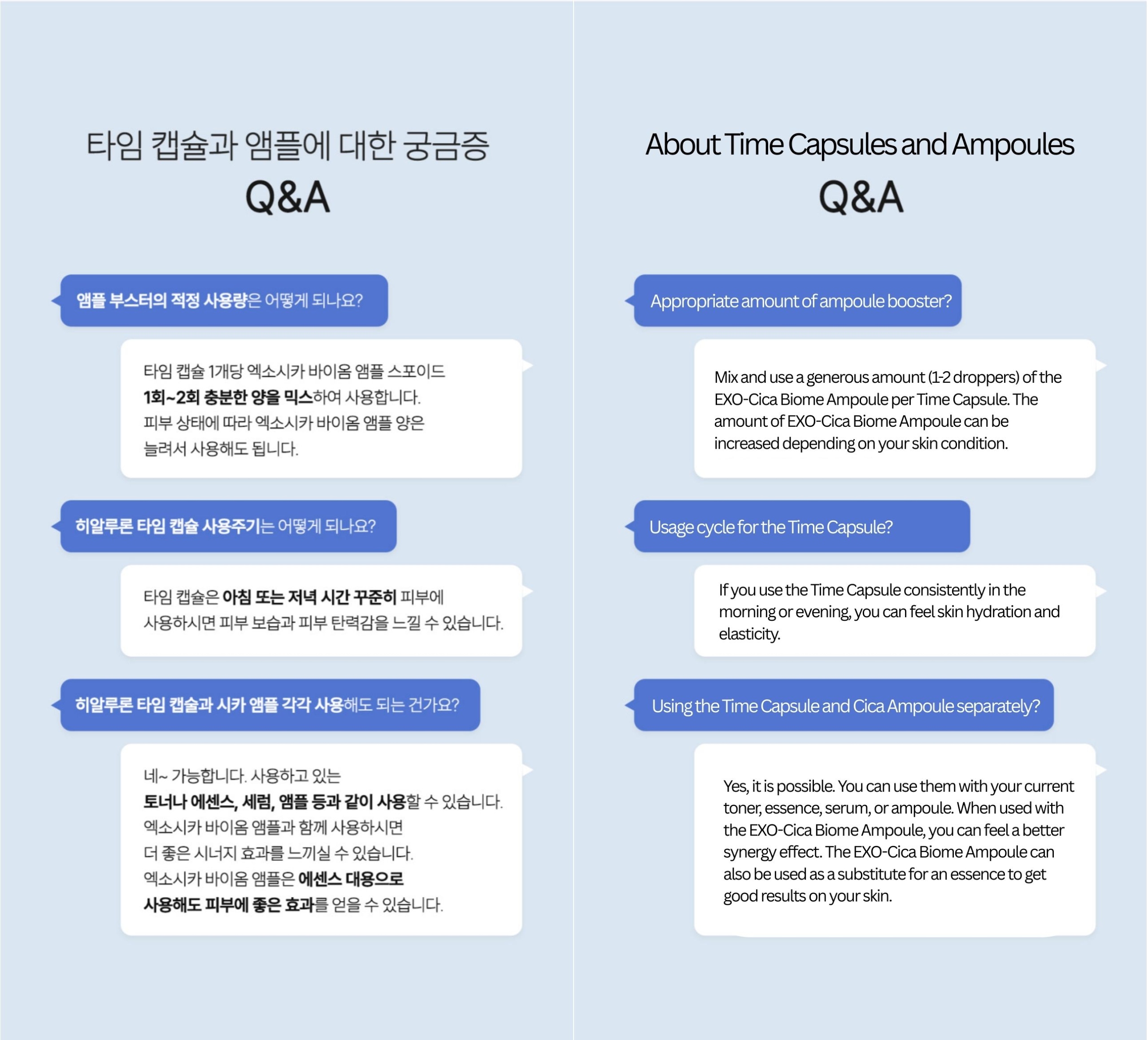 P. Можно ли использовать гиалуроновую капсулу времени и ампулу Cica отдельно? О. Да, возможно. Его можно использовать с тонером, эссенцией или ампулой, которые вы сейчас используете. Использование его с ампулой ExoSICA Bio обеспечит лучший синергетический эффект. Ампулу ExoSICA Bio можно также использовать в качестве заменителя эссенции, что принесет хорошие результаты для кожи.