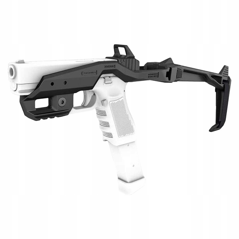 Переоборудование для пистолетов Glock из прочного и легкого полимера, армированного стекловолокном. Благодаря использованию пистолет оснащен передней рукояткой и складывающимся в сторону прикладом, что значительно повышает удобство использования.