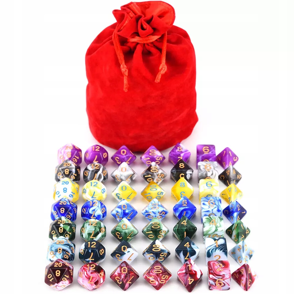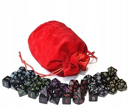 - Стандартные наборы (7 шт), специальные наборы (9 шт дополнительные d10) и увеличенные наборы (10 шт дополнительные d10, d24 и d30)
