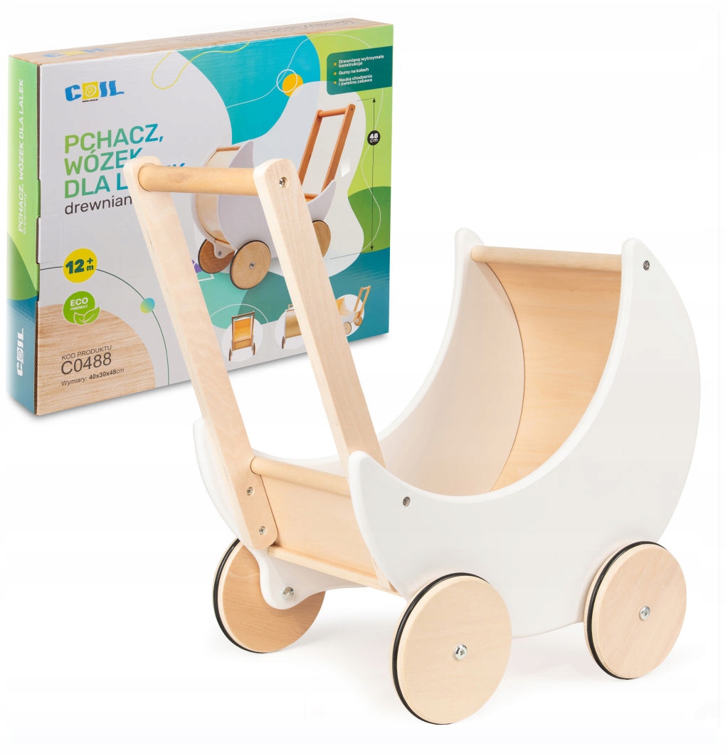 Коляска для кукол - это деревянный толкатель и ходьба для девочек старше 12 месяцев. Сделано из дерева, имеет сертификаты CE и EN 71, что гарантирует его безопасность и качество. Коляска идеально подходит для развития моторных навыков ребенка. Классический белый дизайн делает его подходящим для каждой детской комнаты.