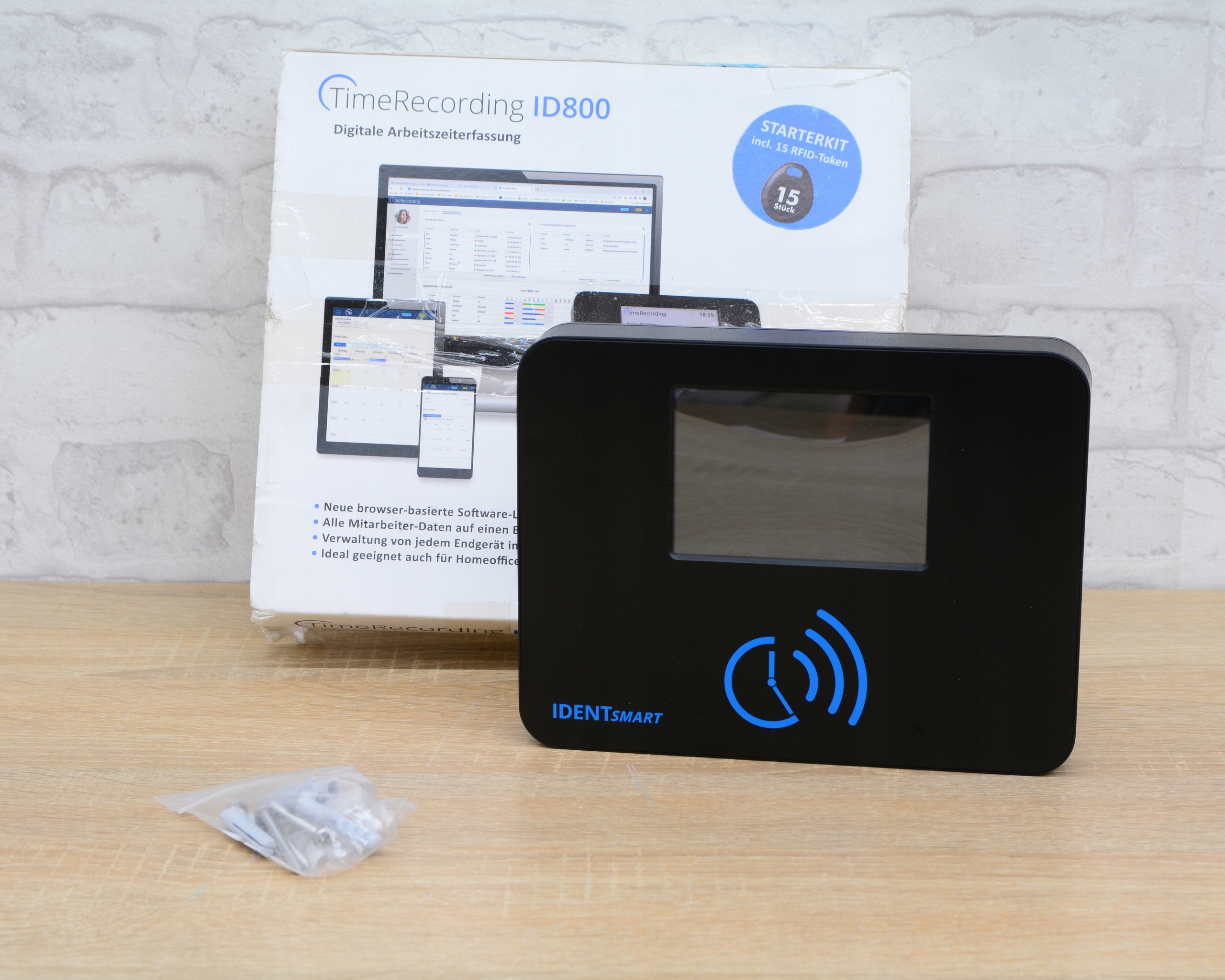 Предметом продажи является демонстрационный набор IDENTsmart TimeRecording ID800 Starterkit LITE, используемый только в презентационных целях в магазине. Это профессиональное и простое в использовании решение для компаний, которые хотят эффективно контролировать рабочее время сотрудников прозрачным и современным способом.