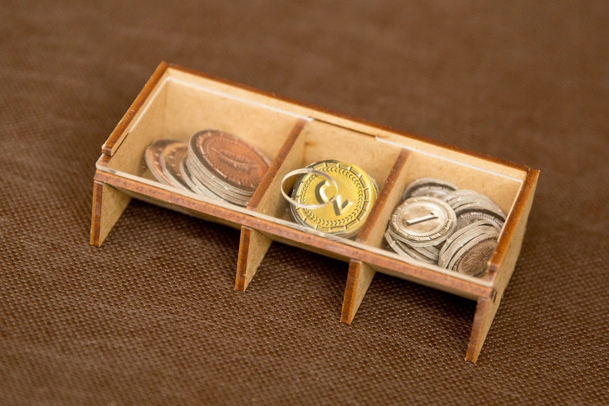 Контейнеры для монет и элементов расширения вместе с частями конфликта и Миневры имеют защелки из плексигласа. Такое решение позволяет хранить коробку вертикально, и содержимое контейнеров никогда не выльется (независимо от того, есть ли у вас аксессуары или нет).