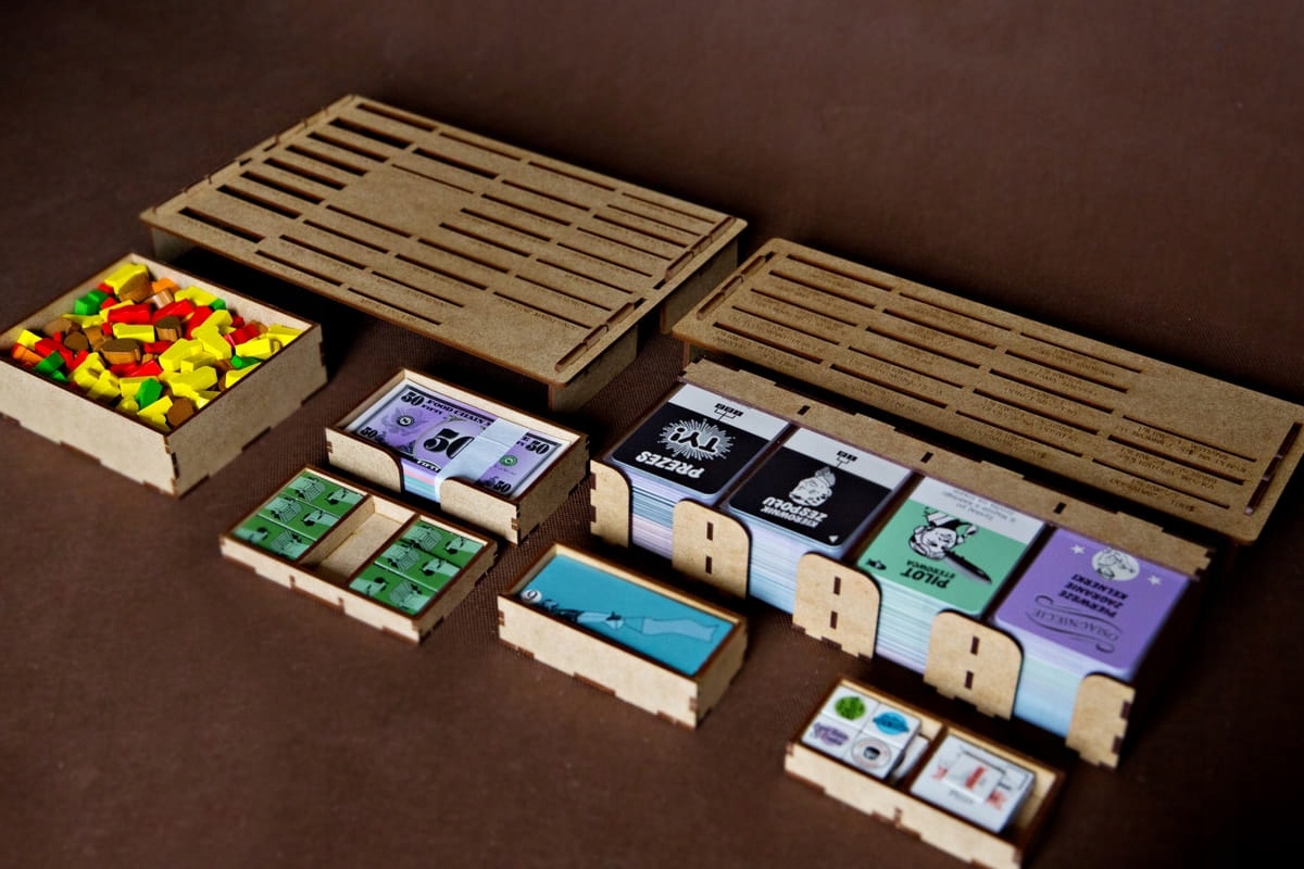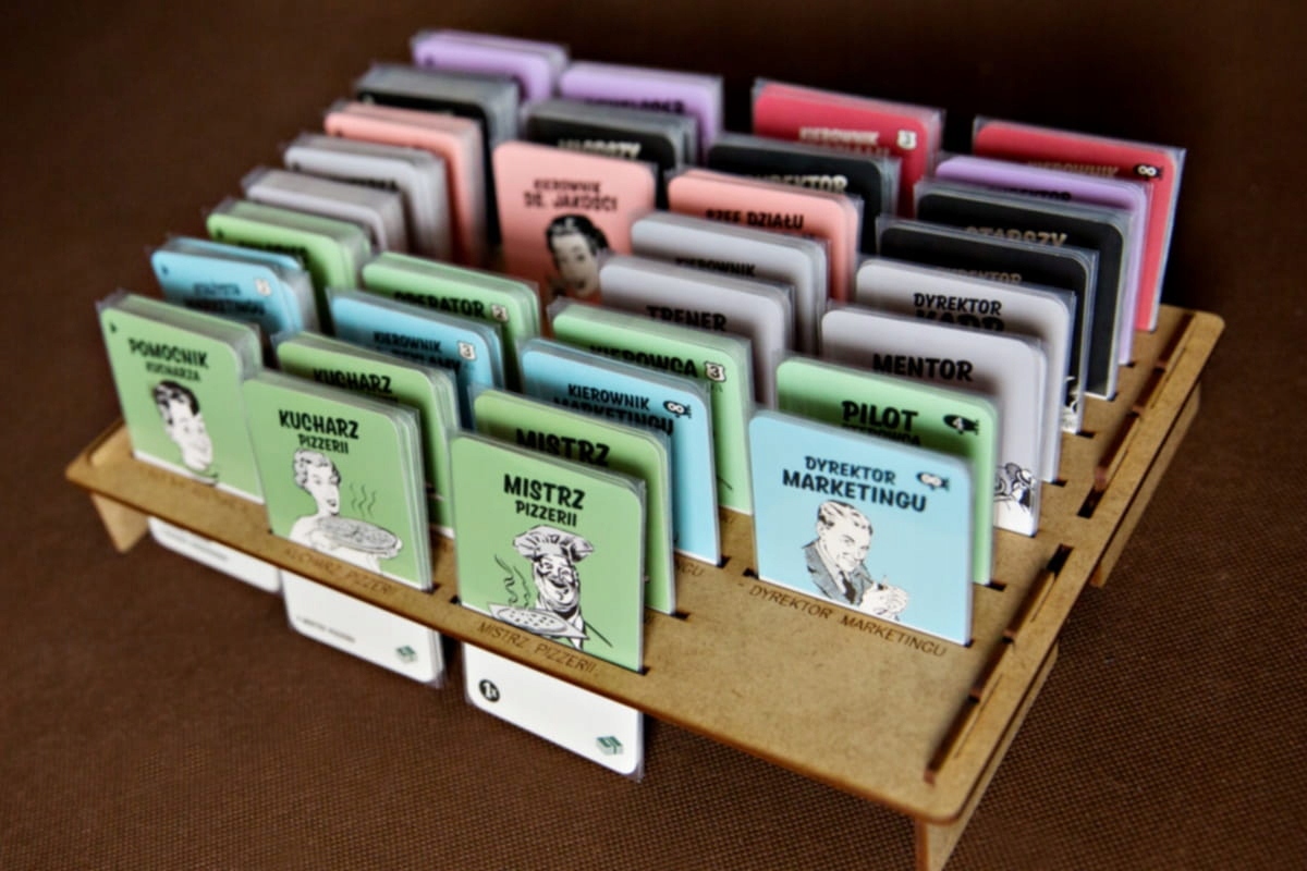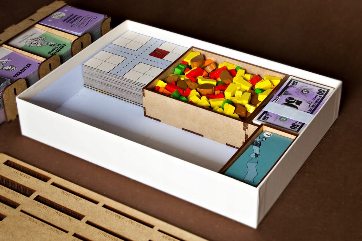Вставка подходит для стратегической игры Food Chain Magnate. Коробка с игрой закрывается, не поднимая крышку. Вставка, помимо контейнеров для карточек, жетонов и других игровых компонентов, содержит два лотка – подставки для карточек сотрудников и карточек достижений. Лотки следует ставить на материальную основу (скатерть, коврик, ткань и т.п.), чтобы предотвратить скольжение карточек в стойке. Вставка предусматривает хранение карточек в футлярах. Варианты обложки для карточек описаны ниже.