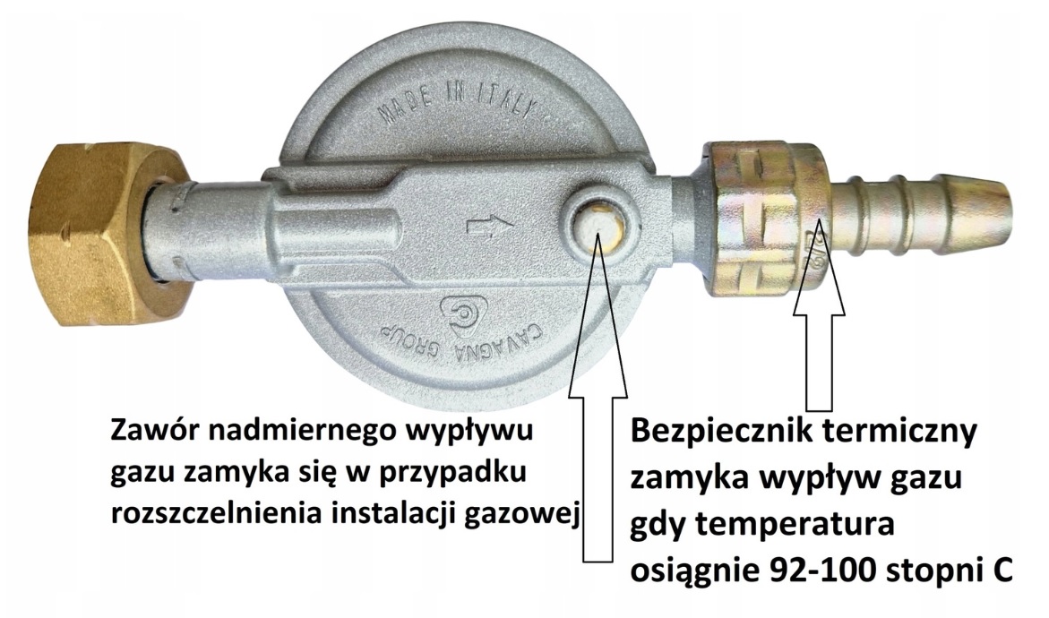 - РЕДУКТОР ОТ ИТАЛЬЯНСКОЙ ГРУППЫ CAVAGNA - Газовый редуктор с термопредохранителем и клапаном избыточного отвода газа для бытовых баллонов 11 кг.