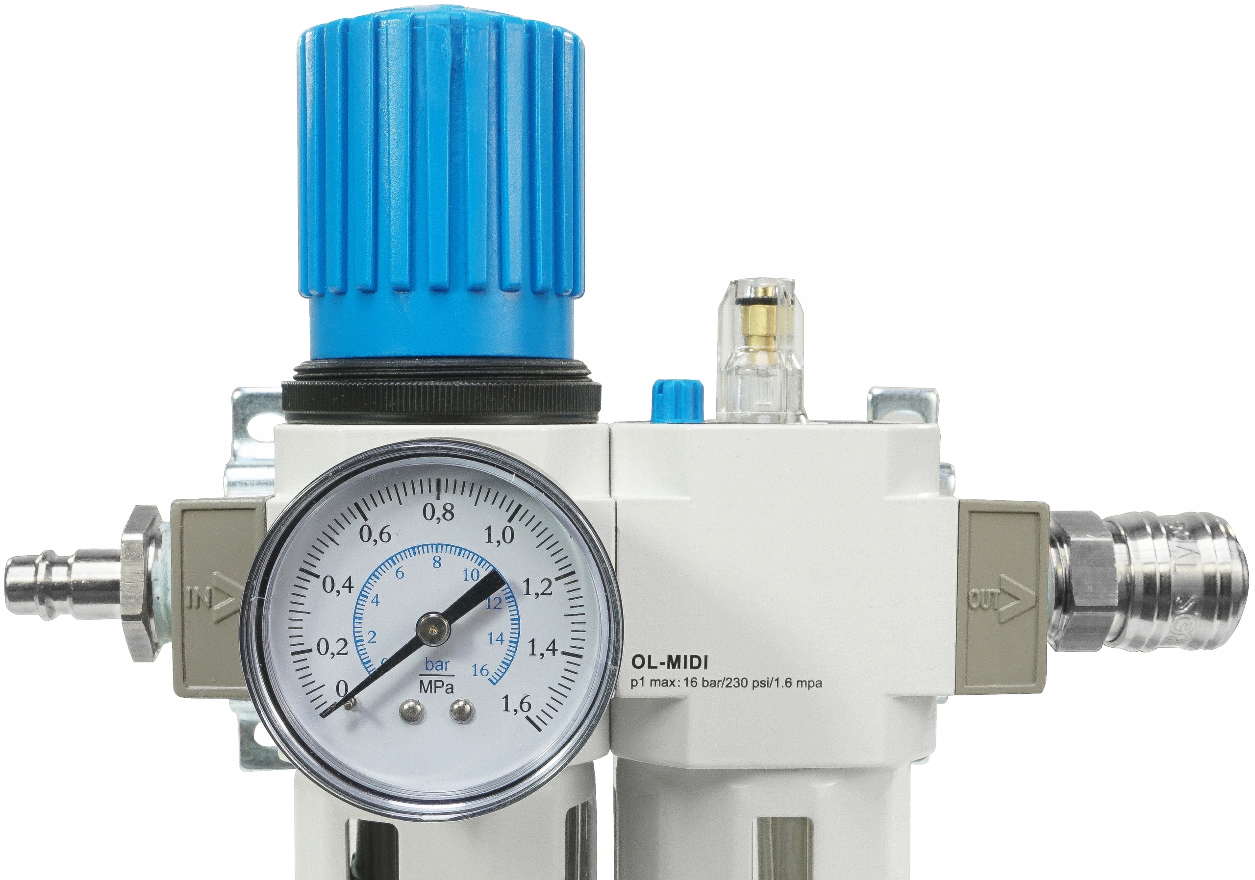 Дозирование масла регулируется винтом, помещенным в верхнюю часть прозрачного купола на дозаторе. Ручка имеет замок, который защищает от непреднамеренного изменения настройки - разблокировка их должна разблокировать, подтягиваясь. Диапазон измерения датчика давления составляет 0 - 16 бар. Щит масштабируется в барах с точностью 0,2 бар. Датчик давления может быть установлен в порт на корпусе фильтро -реквизита - есть два соединения на выбор: спереди или сзади. Неиспользованный порт должен быть ослеплен. Быстрый разъем и плагин в наборе