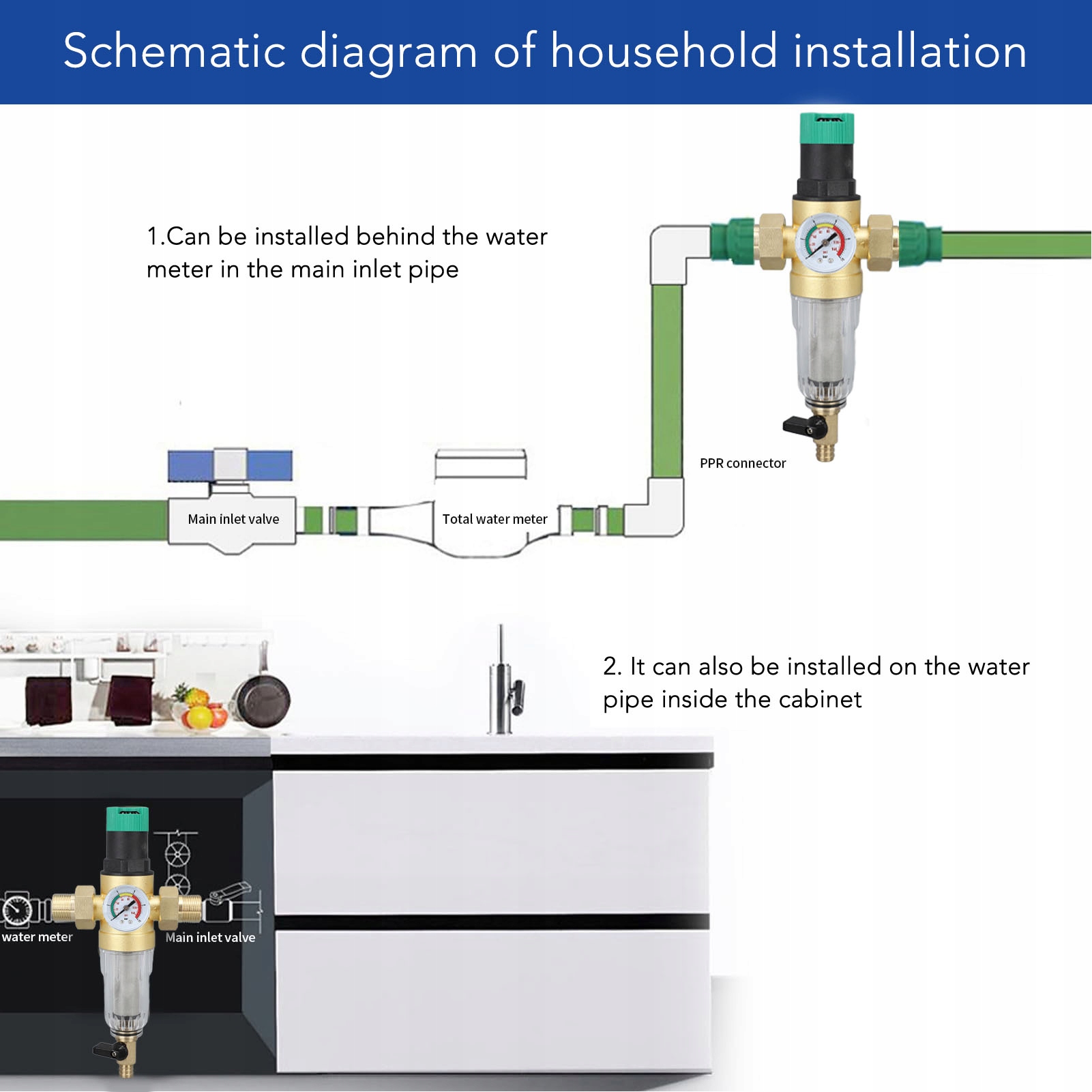 1. Регулятор давления с водным фильтром: улучшенный предварительный фильтр с точным датчиком давления воды, который контролирует и регулирует давление воды, вытекающую в режиме реального времени. Сам предварительный фильтр оснащен 1 -дюймовыми резьбами и дополнительным адаптером до 1/2 дюйма. Перед покупкой проверьте, какой размер вам нужен.