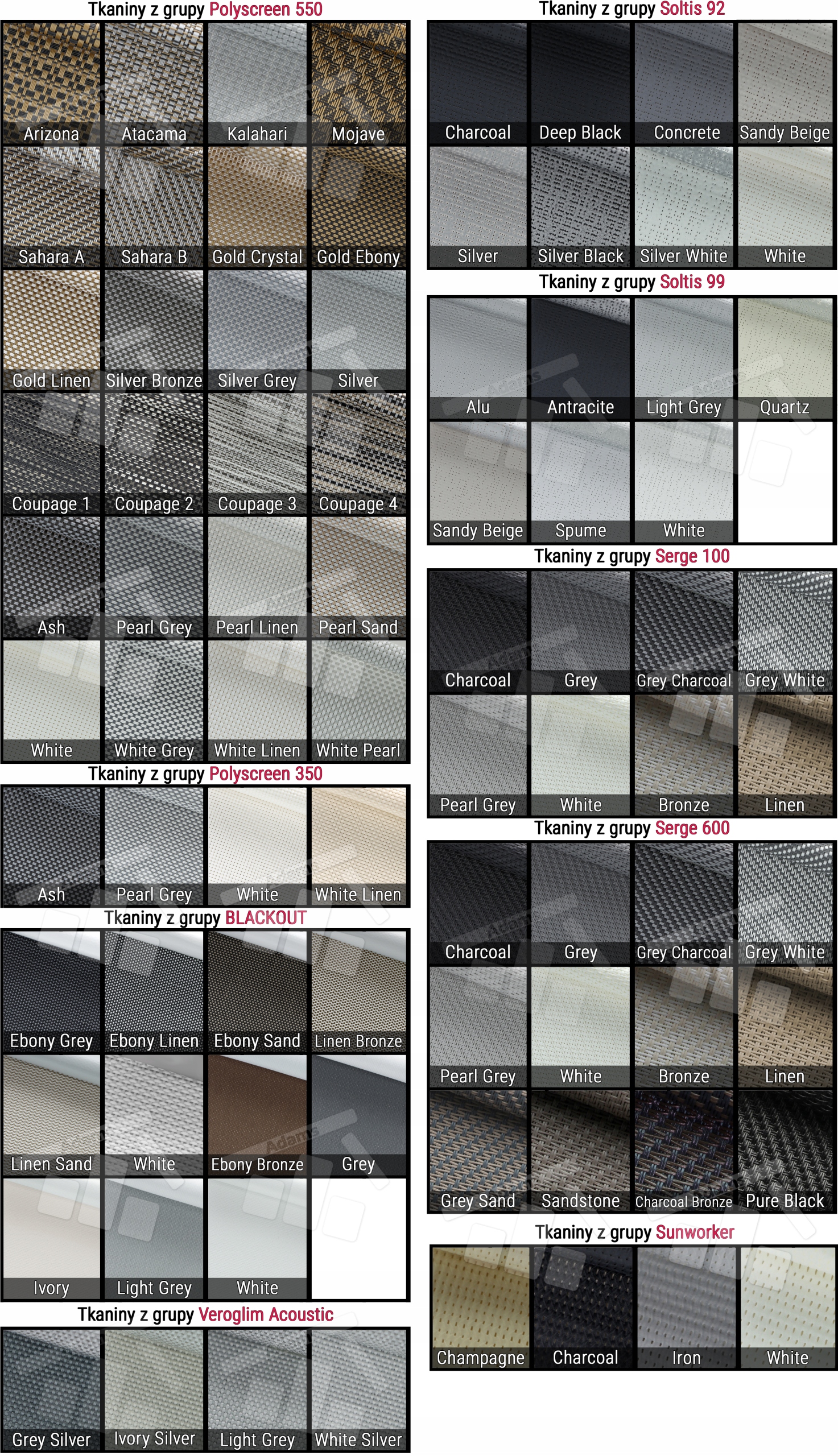 Выберите один из типов ткани. Экранные ткани представляют собой комбинацию ПВХ и полиэстера. В зависимости от выбранной группы они обладают разными свойствами, такими как свето- или звукопроницаемость.