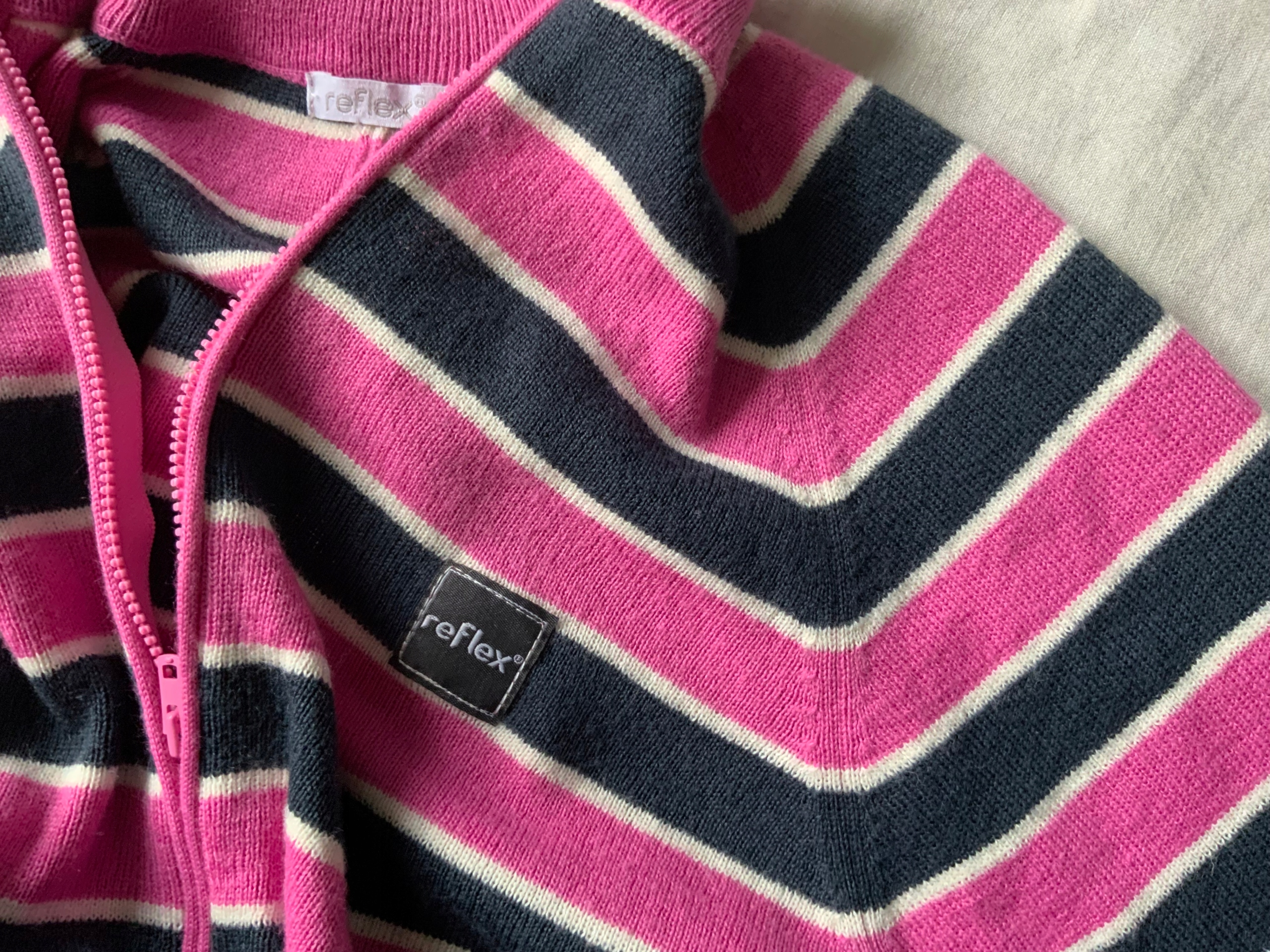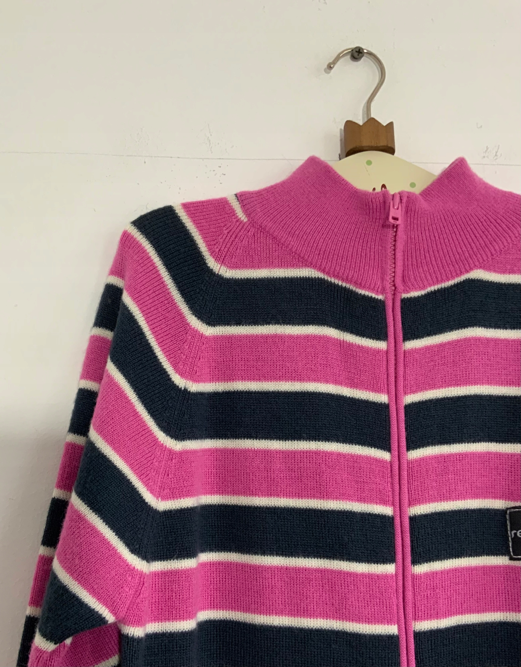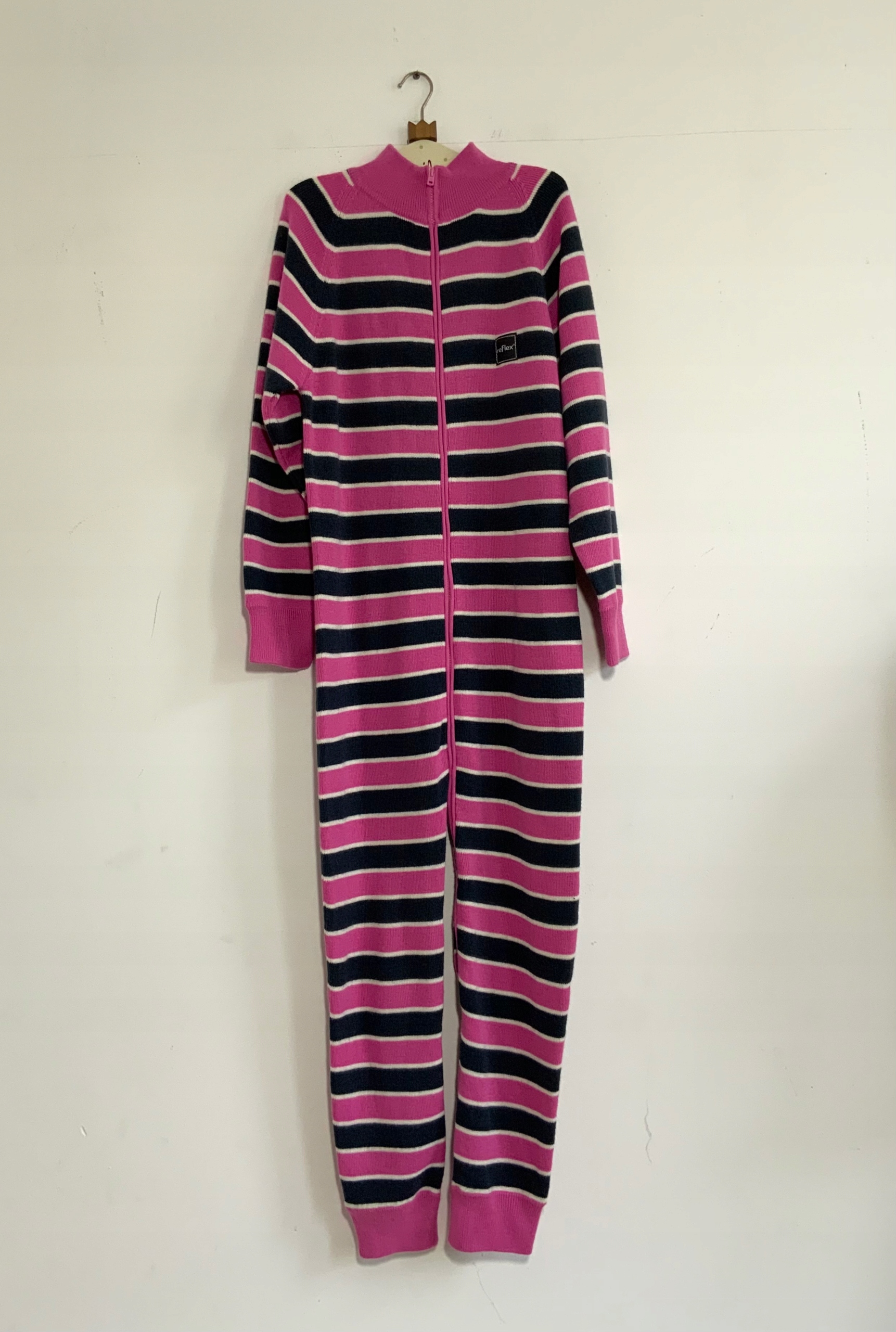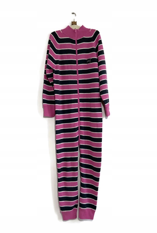 Свитер-комбинезон-комбинезон с темно-синими и розовыми полосками. Застегивается на молнию. Воротник-стойка