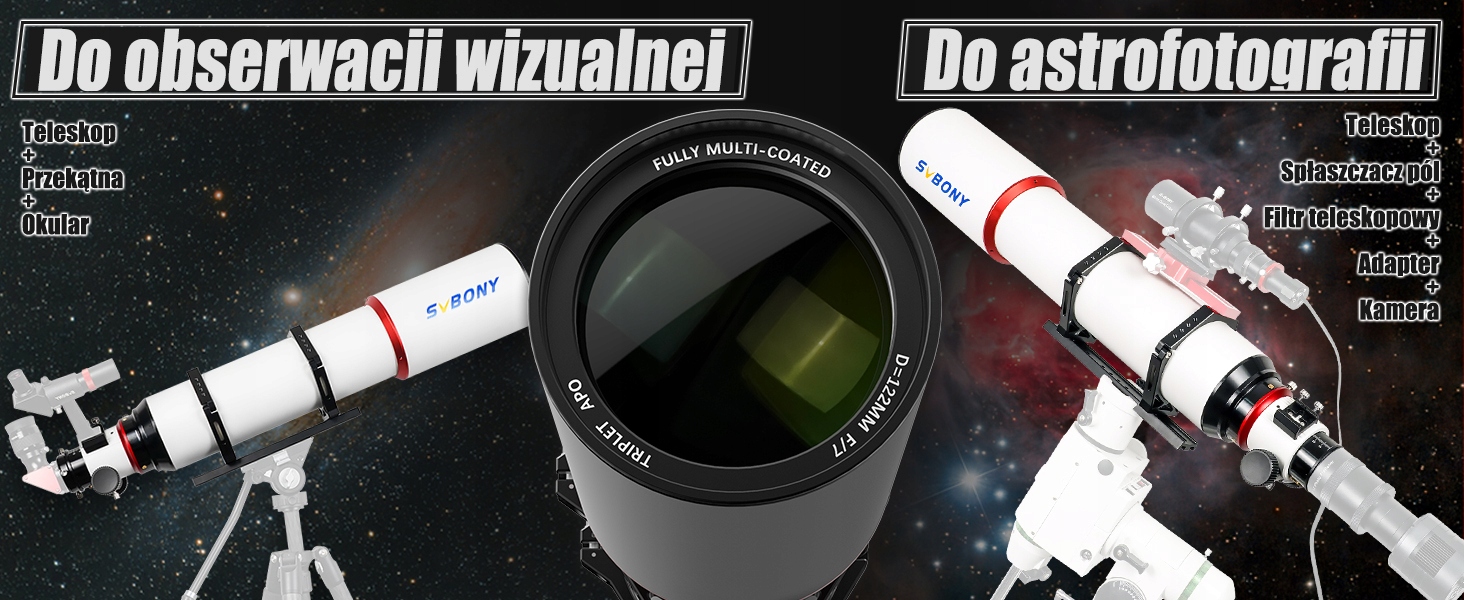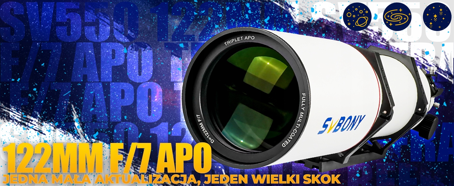- Рефрактор SV550 APO представляет собой компактный рефрактор с апертурой 122 мм; фокусное расстояние f/7 и фокусное расстояние 854 мм; идеальный дорожный телескоп для астрофотографии и наблюдений; OTA весит 6,44 кг/14,18 фунта, и его легко переносить, если он установлен в футляре.