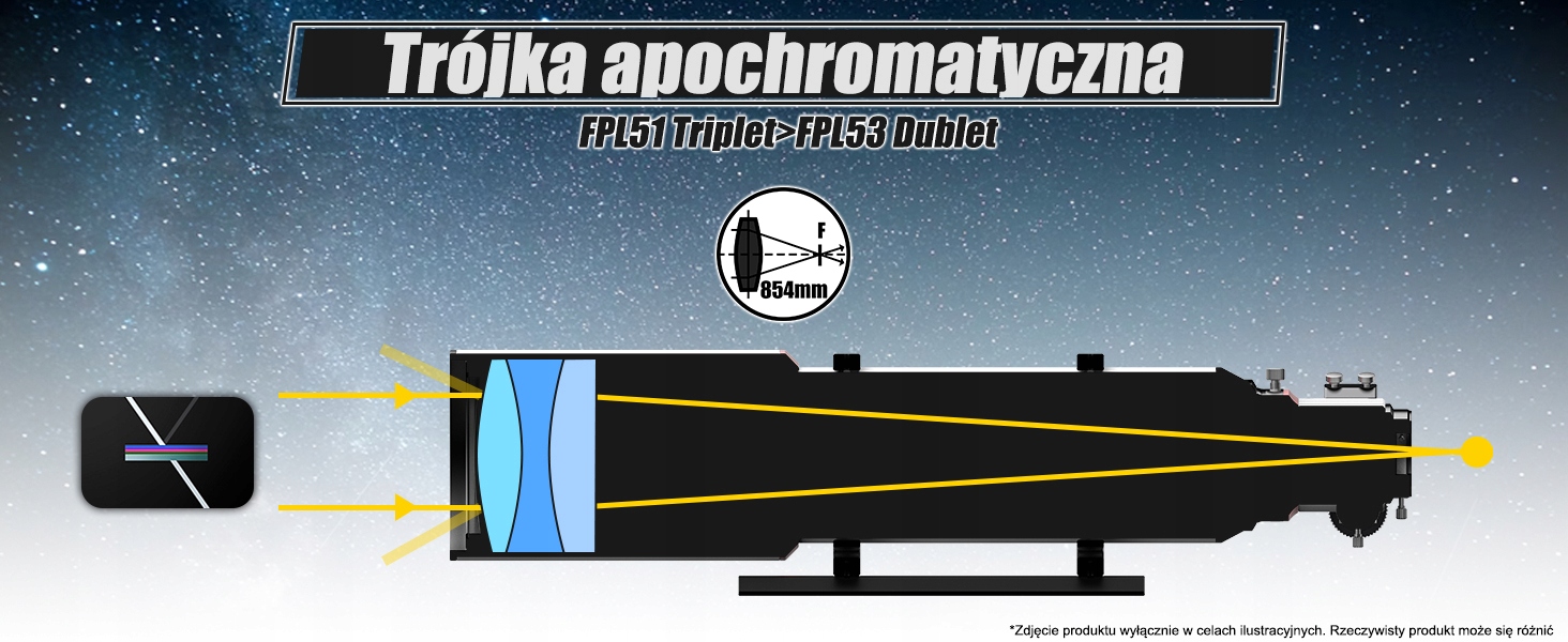 - Объектив SV550 122 мм имеет тройную апохроматическую структуру линз; который содержит один кусок стекла FPL51 ED; Триплетный объектив обеспечивает лучшую коррекцию аберраций, значительно уменьшает хроматическую аберрацию и повышает четкость и резкость.
