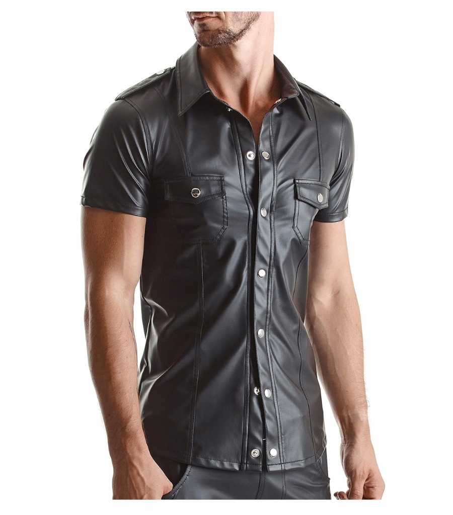 Внимание, выпятите грудь – Мастер идёт. Замечательная, классическая рубашка военного кроя, однако... Если присмотреться, то можно увидеть модные источники вдохновения для этого продукта. Кроме того, есть визуальные особенности и решения, которые оценят любители мира фетиш-одежды. Длинная вертикальная строчка спереди и сзади оптически стройнит фигуру. Кроме того, рубашка имеет крой Slim-Fit, который оптически стройнит фигуру в талии и эффектно обнажает грудь. Также обращают на себя внимание металлические декоративные кнопки, расположенные на карманах, погонах и спереди по всей длине. Полностью изготовлен из высококачественного черного гибкого мокрого материала. Характерная красная этикетка из алькантары с логотипом RFP и красной точечной строчкой порадует любого, кто ценит изысканные и уникальные детали. Он отлично смотрится с брюками RMVittorio001.