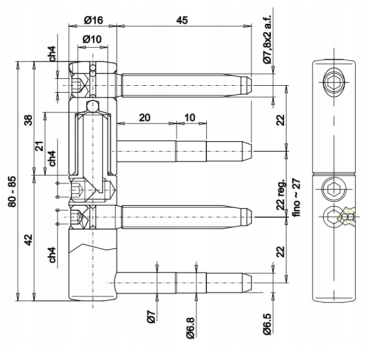 Петля ввинчивающаяся с регулировкой в трёх плоскостях, регулировка которой осуществляется одним ключом, без необходимости демонтажа двери. Тефлоновая вставка в верхней части петли защищает материал от истирания, а винты на шарикоподшипниках гарантируют точную регулировку. Конструкция штифтов обеспечивает стабильное и надежное крепление петли.