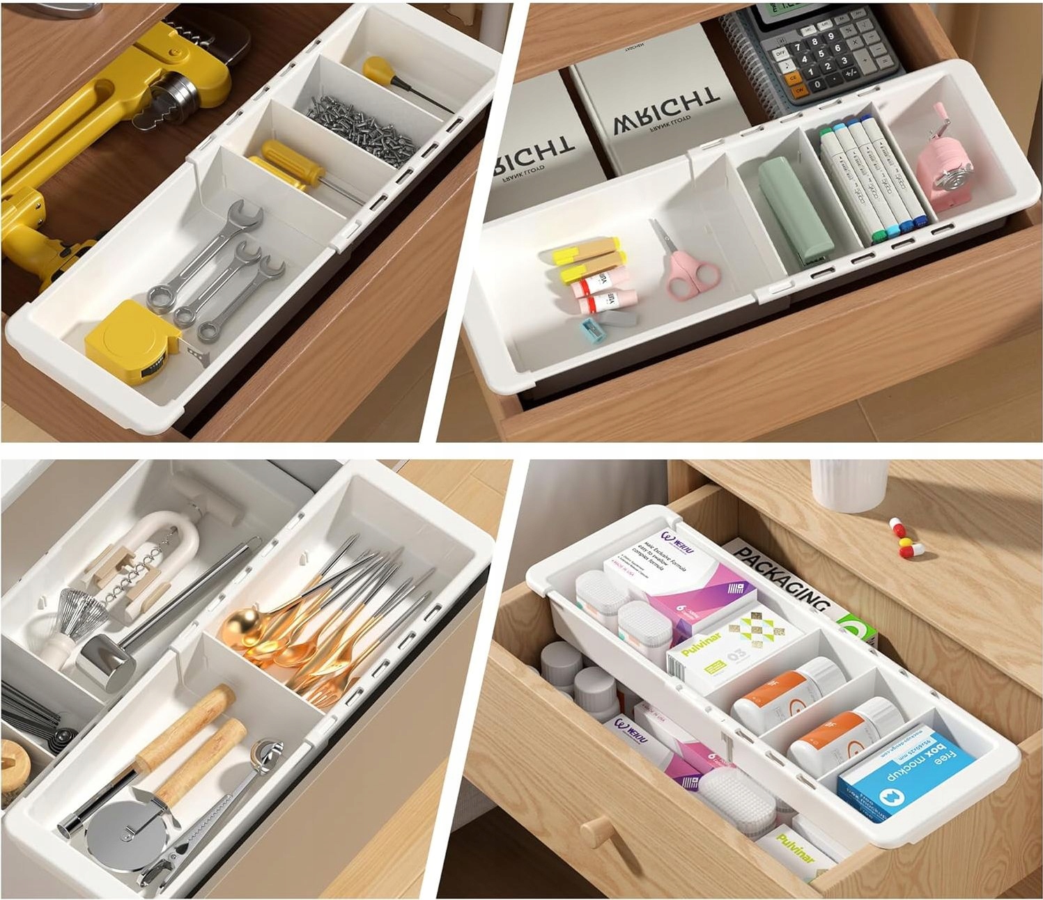 Идеальный размер – благодаря размерам 29-46 см. х 15,5 см х 5,8 см органайзер можно легко расширить с 29 см до 46 см. Расширяемая конструкция подходит для большинства ящиков спереди назад или из стороны в сторону, поэтому вы можете расширить органайзер до размера любого ящика в вашем доме или офисе.