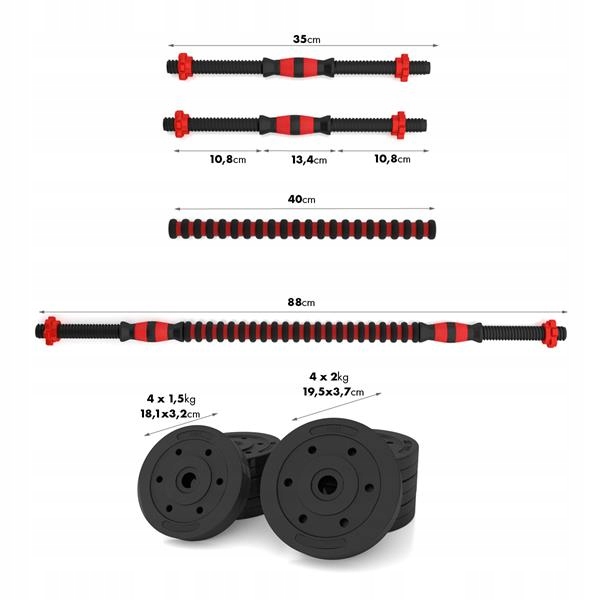 В комплект входят две штанги, четыре зажима, соединительные две штанги и всего 8 весовых блинов.