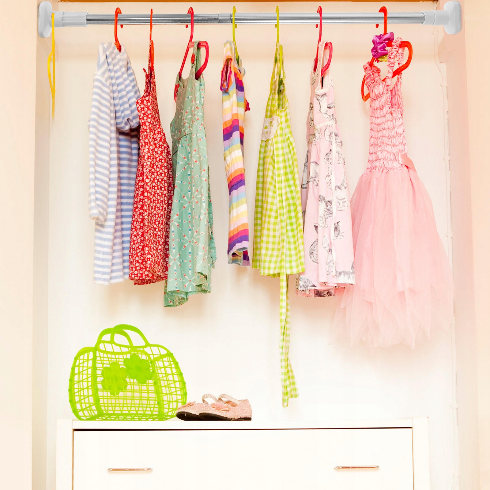✅Простота установки, просто растяните стержень до тех пор, пока его можно будет прочно закрепить на обеих стенах.