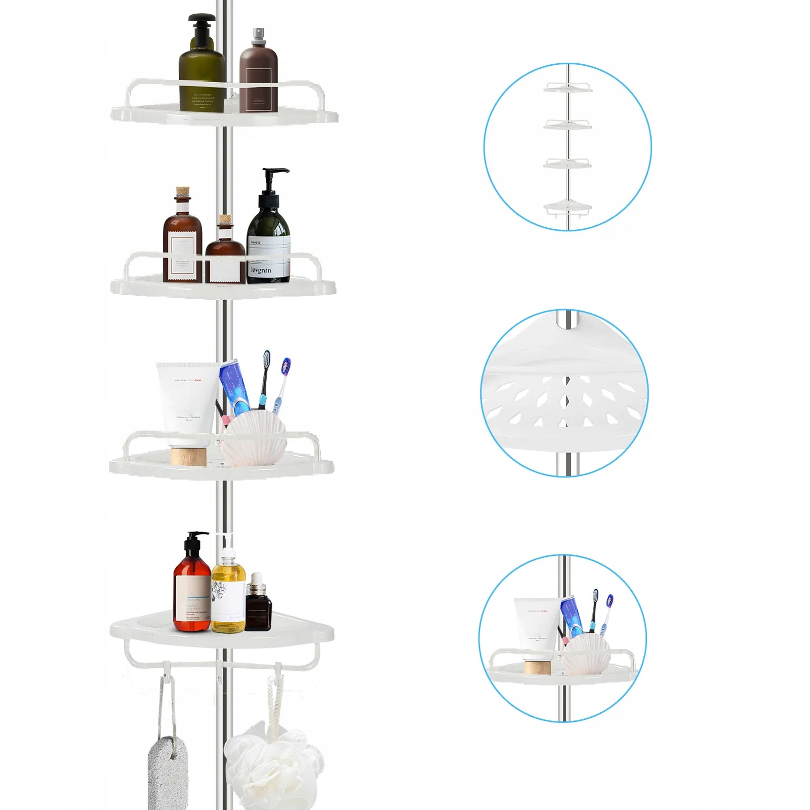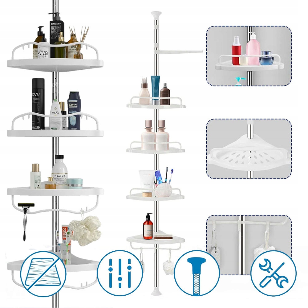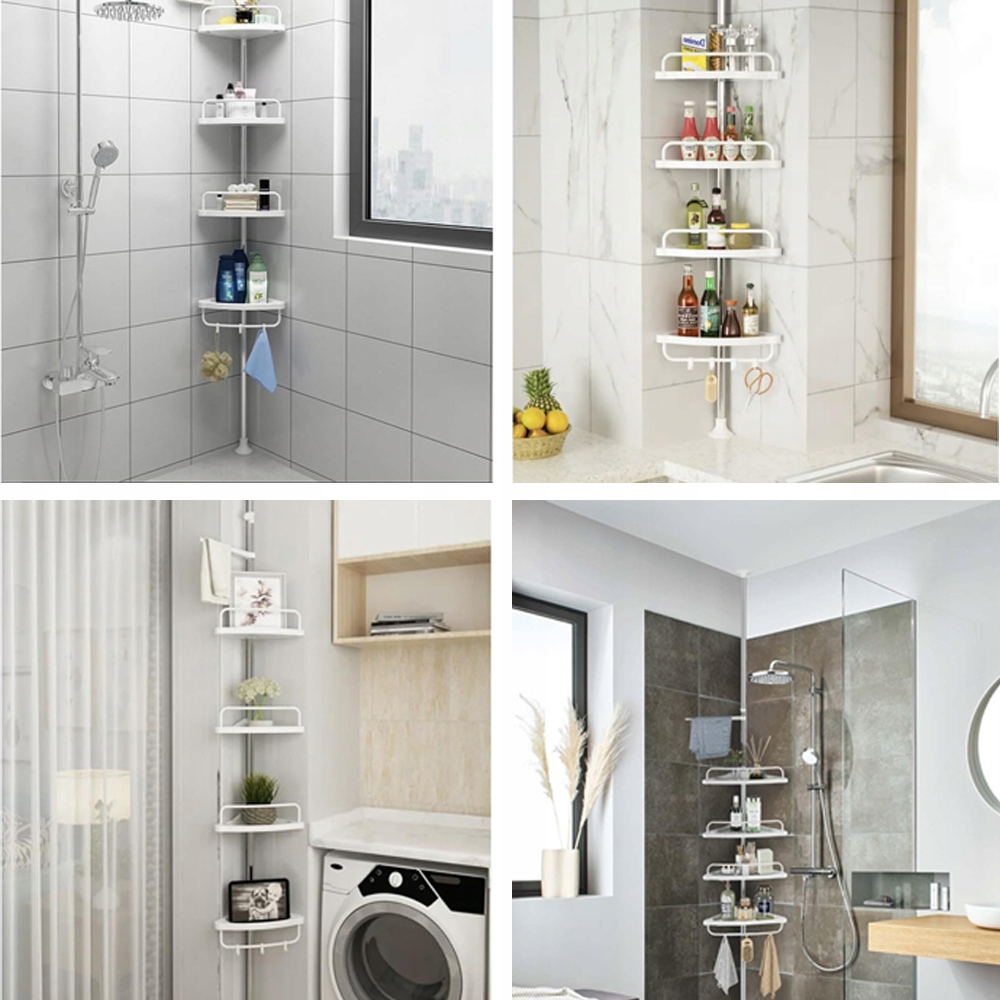 👍👍👍【Различные аксессуары】:Регулируемая по высоте душевая стойка, в комплект входят 4 душевые корзины, 3 крючка. Угловая полка в ванной имеет утолщенную полку, способную увеличить грузоподъемность вдвое. Полка спроектирована таким образом, чтобы разместиться в углу и максимально эффективно использовать пространство.