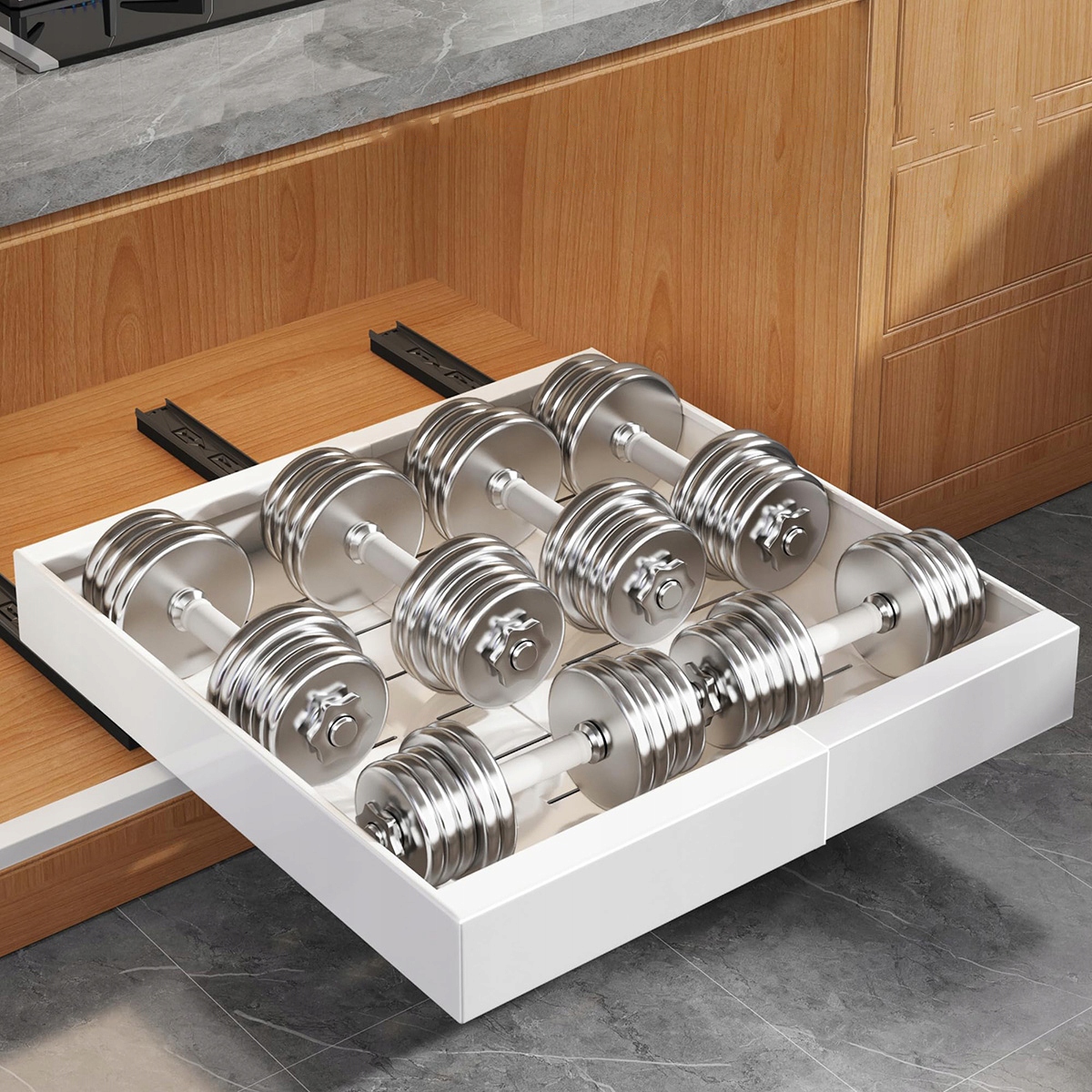 Легкий доступ благодаря выдвижному органайзеру: поддерживайте порядок в своих шкафах с помощью нашего выдвижного органайзера. Его плавная и тихая работа без каких-либо заеданий обеспечивает легкий доступ к нужным вещам. Мягкие направляющие обеспечивают бесперебойную работу.
