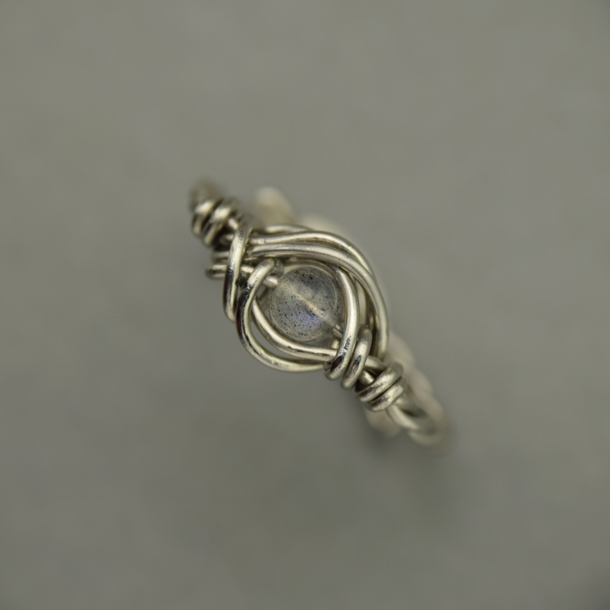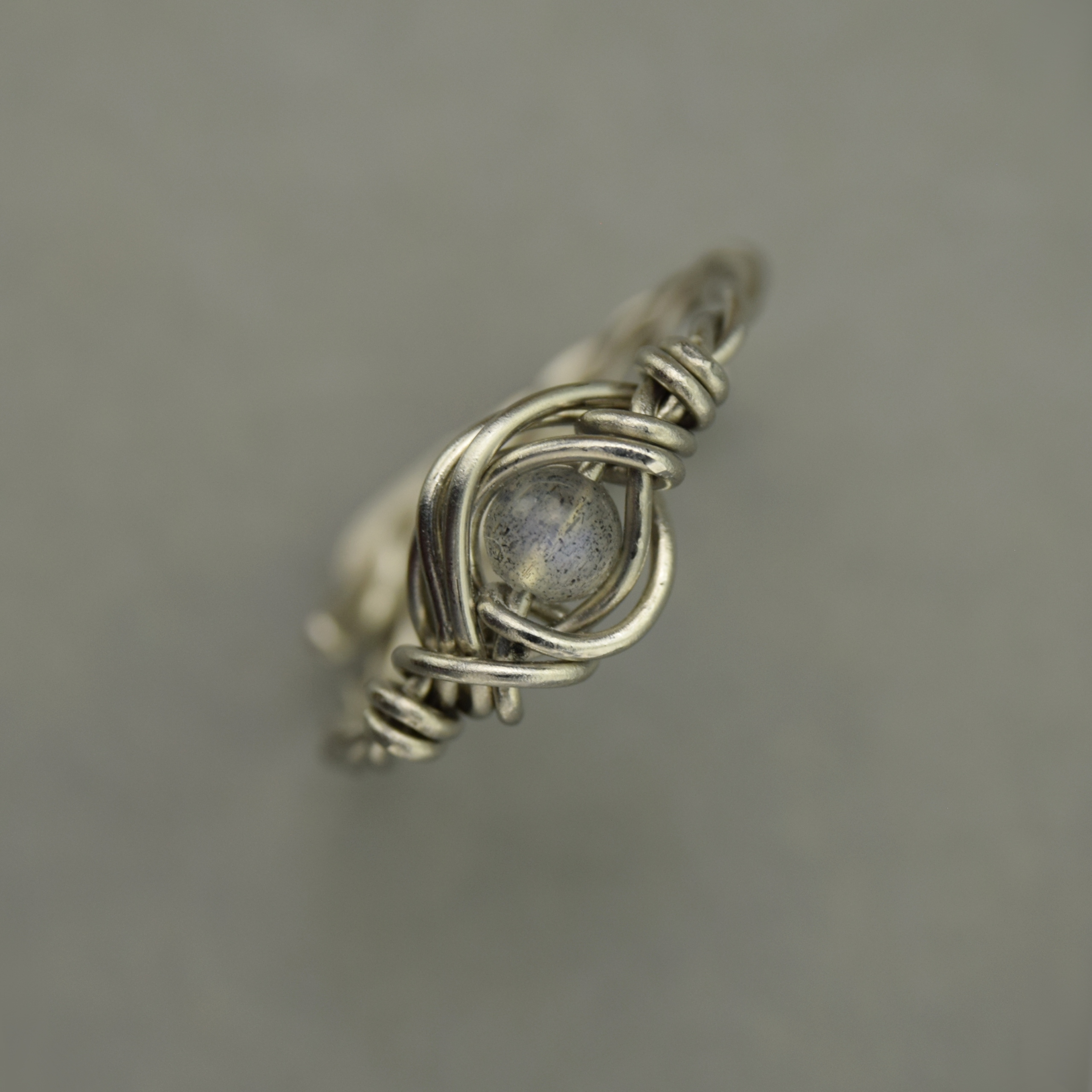 Минималистическое кольцо с лабрадоритом, который нежно переливается фиолетовым, но, к сожалению, мне не удалось его запечатлеть на фотографиях. Кольцо изготовлено вручную в технике намотки из проволок из хирургической стали.