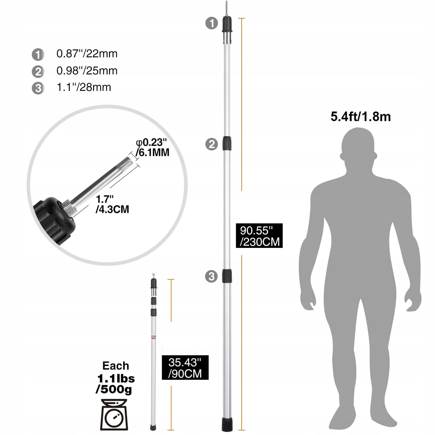 ⏩⏩ Регулируемая легкость: широкий диапазон регулировки от 35,5 дюйма/90 см до 90 "до 90"/230 см с 3 секциями. Каждая мачта весит всего 1,1 фунта/500 г, вы можете взять его везде, где вы хотите.