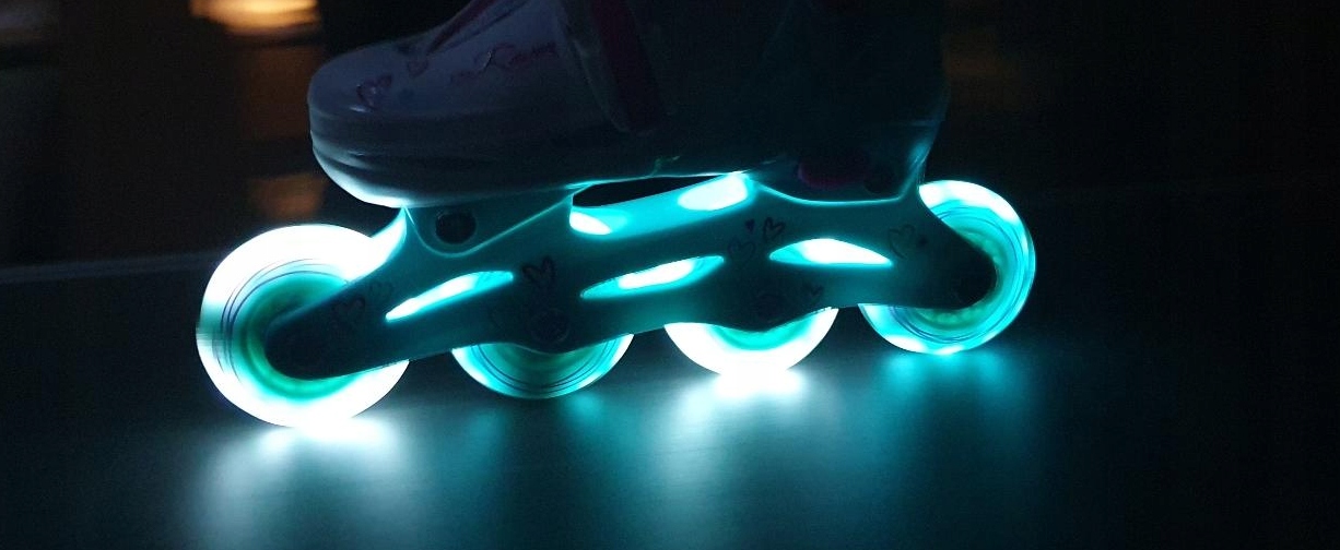 - Роликовые коньки оснащены светящимися колесами, которые загораются при движении.