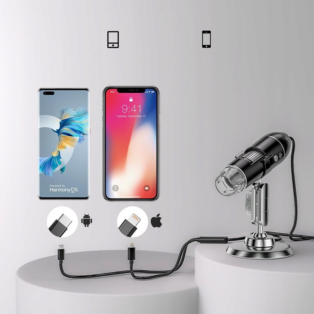 Это портативный цифровой микроскоп высокого разрешения, который подключается непосредственно к вашему телефону. Во время использования продукт подключается напрямую к интерфейсу мобильного телефона и поддерживает мобильные устройства Android (OTG) или iOS. Его удобнее и быстрее использовать.