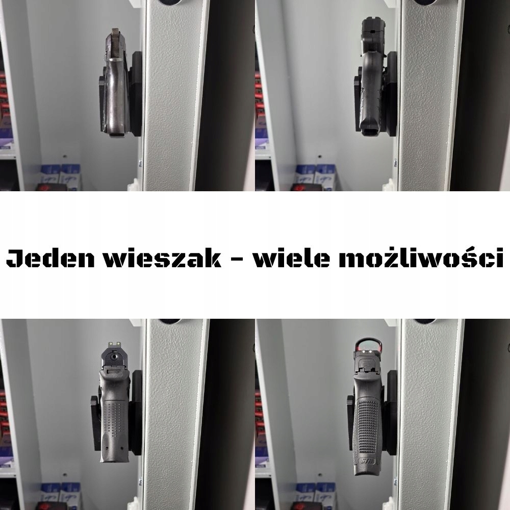 Это наш оригинальный проект, которого всегда не хватало на рынке. Разработанная нами система позволяет подогнать вешалку под ваше оружие, а не наоборот. Не нужно перед покупкой думать, покупать левую или правую подвеску, нет опасений, что она окажется слишком велика или мала для нашего оружия. Вешалка имеет 3 варианта регулировки (перемена местами правой и левой сторон, изменение ширины ручки и отвод ручки от стенки вешалки. Предлагаем вам увидеть возможности нашей вешалки в подготовленной нами короткой видеопрезентации на YouTube: https://youtu.be/onOL1jcynhM