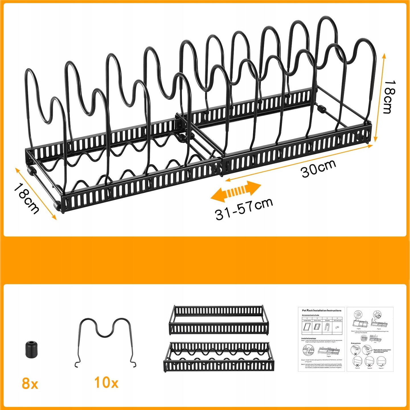 Наш расширяемый органайзер для сковородок легко собрать. Вы можете собрать его за считанные минуты без инструментов. Его можно использовать в качестве отдельного регулируемого держателя крышки кастрюли, а также разделить на два независимых органайзера для кастрюль для отдельного использования, чтобы лучше адаптироваться к кухонному пространству.