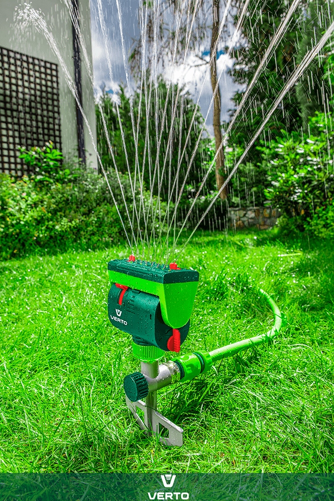 Осциллирующий садовый дождеватель, с разнонаправленной регулировкой, площадью орошения до 208 м2, производства VERTO. Имеет 16 форсунок.