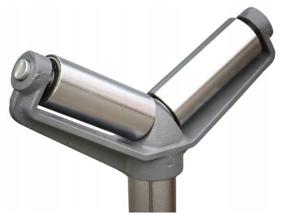 V-роликовый питатель был разработан с учетом высокой функциональности и долговечности. Конструкция основана на прочных стальных профилях, которые гарантируют достаточную жесткость даже при интенсивном использовании. V-образное расположение роликов обеспечивает естественное самоцентрирование цилиндрических материалов, что существенно повышает точность их подачи. Механизм регулировки высоты позволяет плавно и без инструментов регулировать рабочее положение по высоте станка, что облегчает интеграцию с ленточными пилами, токарными станками и другими станками.