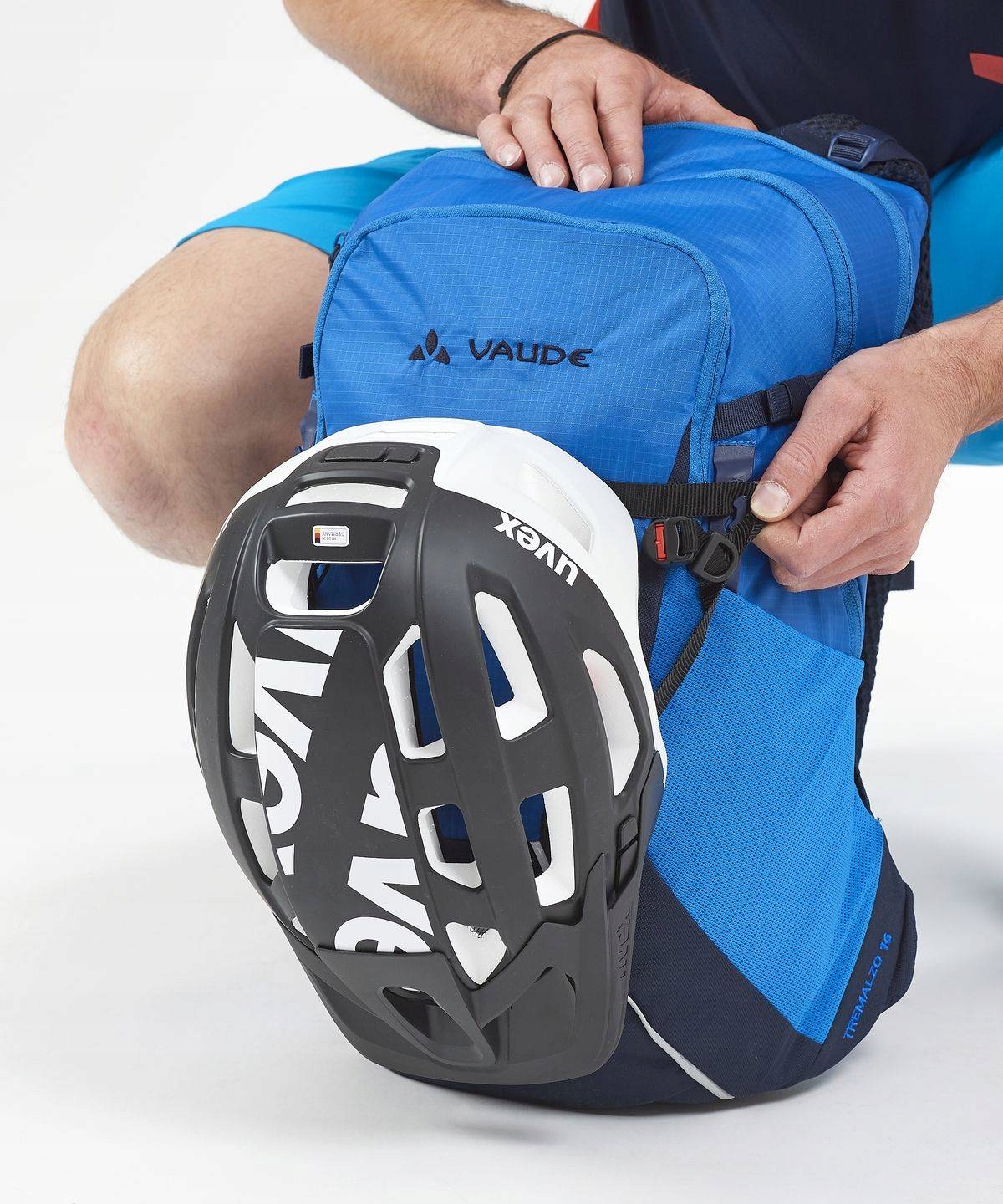 Велорюкзаки VAUDE оснащены держателем для шлема, который хранится в небольшой сумке или встроен в конструкцию рюкзака. Разные модели рюкзаков предлагают разные варианты крепления.