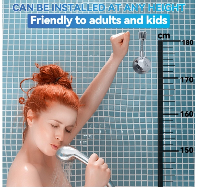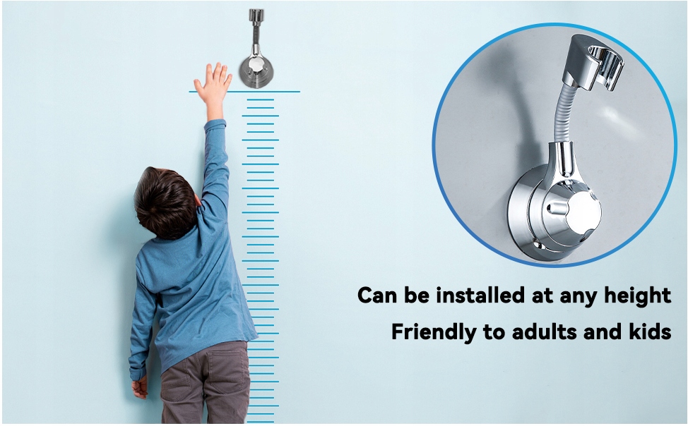 - Регулируемая ручка для душа на 360 °: наш новый держатель для душа использует универсальную трубку из нержавеющей стали, которая является более гибкой, чем обычный держатель для душа. Это позволяет вам установить головку разбрызгивателя на 360 ° вверх, вниз, влево и вправо. Чтобы удовлетворить потребности душа, вы можете сделать то, что хотите, например, Позвольте вашему ребенку или родителям положить руки в низкое место
