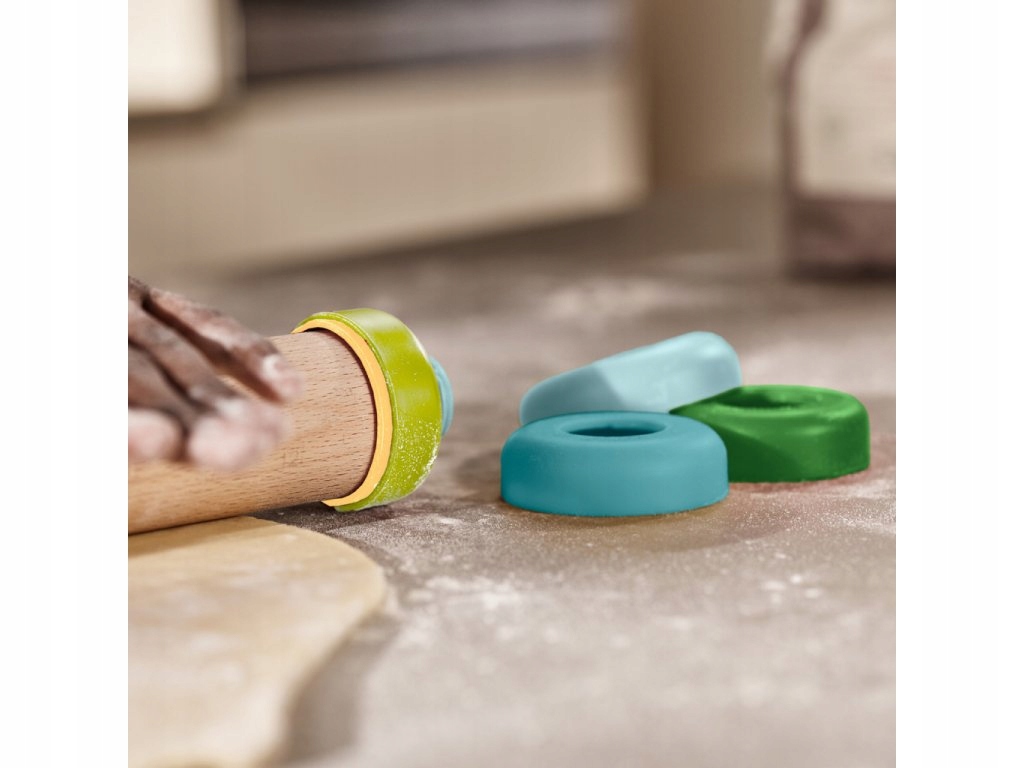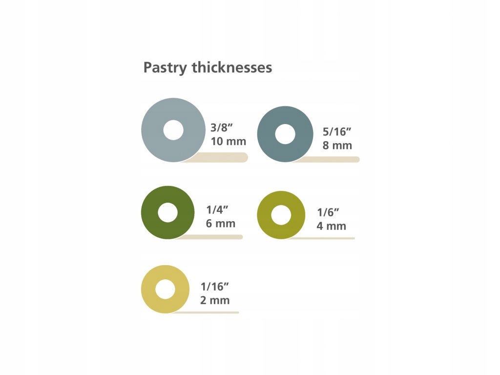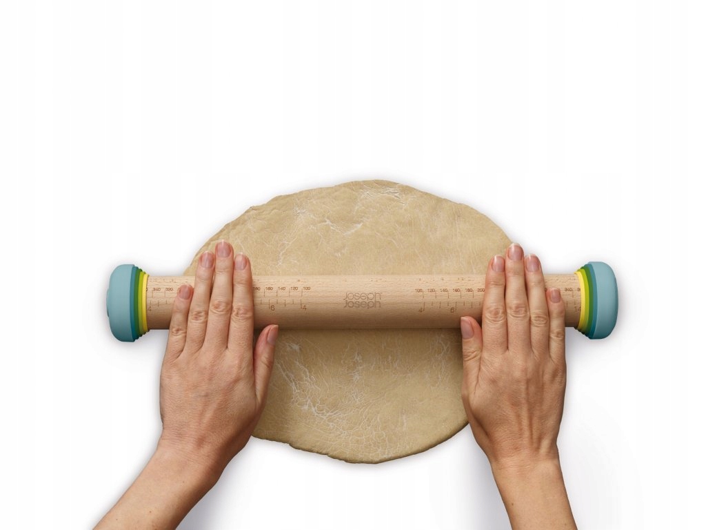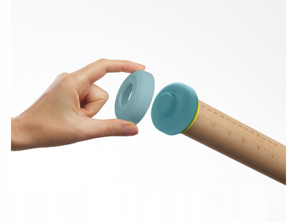Регулируемый ролик Джозеф Джозеф 40118 Duo PrecisionPin с пятью парами съемных красочных колец, чтобы отрегулировать необходимую толщину катящегося теста (2, 4, 6, 8 и 10 мм). Поверхность вала откалибрована от 140 мм до 340 мм. Фотографировать кольца с простым вращением. Без колец он используется в качестве обычного ролика