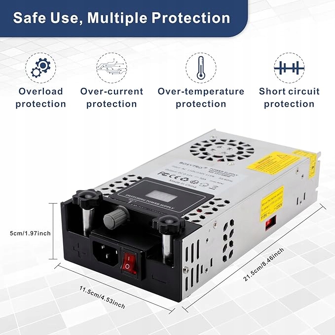 . Boshythro оснащена не -скольжкой, которая вызывает устойчивую операцию и более высокую галлон.Если вы используете двигатель, вентилятор или другую индукционную нагрузку, обратите внимание на параметр максимального тока нагрузки. Этот параметр не может быть выше, чем максимально допустимый ток источника питания. В противном случае источник питания может быть поврежден. В качестве альтернативы, вы можете использовать тонкую защиту от стартера для загрузки для поглощения тока удара. Высокое напряжение внутри, никогда не снимайте крышку. Не перегружайте устройства, чтобы избежать повреждения оборудования. Максимальное использование не должно превышать 80% полной нагрузки, в противном случае обслуживание источника питания значительно снизится.