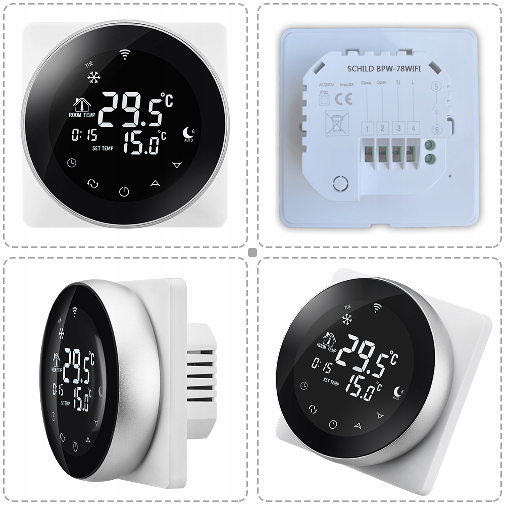 - Термостат также управляется через WIFI, большой стеклянный экран, очень современный дизайн. Термостат Schild BPW-78WIFI с большим сенсорным экраном, светодиодной подсветкой.< /li >