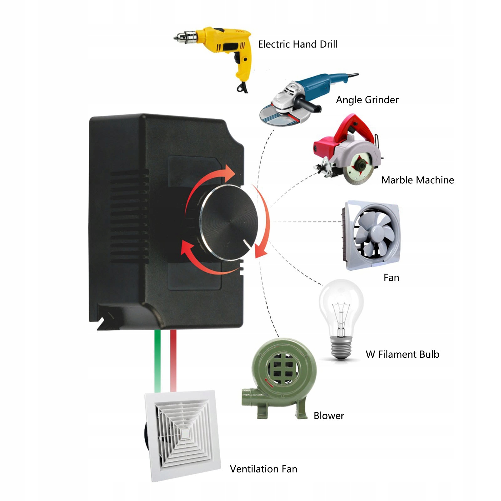 2. Широкое применение: этот регулятор скорости подходит для различного оборудования, такого как вытяжные вентиляторы, вольфрамовые лампы, электроплиты, угловые шлифовальные машины, мраморные машины, воздуходувки.