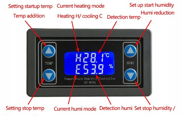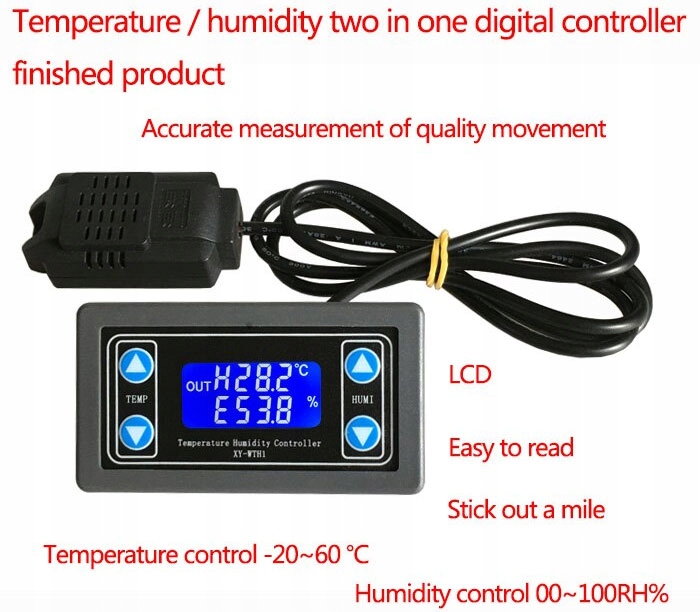 xy-wTh1 Температура и влажность модуля-это устройство, которое позволяет переключать нагревание или охлаждение, чтобы регулировать температуру на основе показания с использованием датчика температуры Полем Кроме того, влага измеряется с помощью датчика. Из -за установленных параметров устройство прикрепляет реле, которое позволяет вам увлажнять или сухой воздух. Диапазон измерения температуры составляет от -20 ° C D 60 ° C, в то время как влажность: 0-100%. Модуль предназначен для установки на панели. Большой дисплей информирования о текущей температуре и влажности. Контроллер микропроцессора
