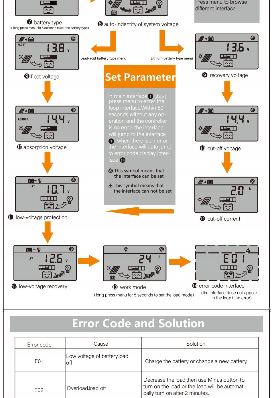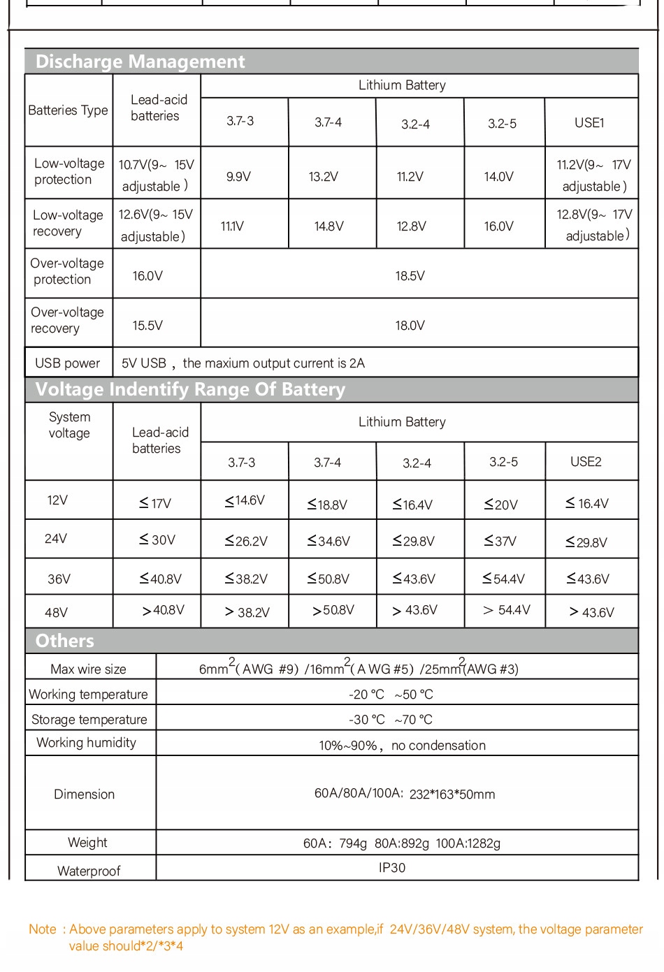 Кислотные (2,1В) - 24S, AGM (2,1В) - 24S, GEL (2,1В) и даже если у вас аккумуляторы с необычным напряжением элементов, вы можете вручную установить индивидуальный диапазон рабочего напряжения.