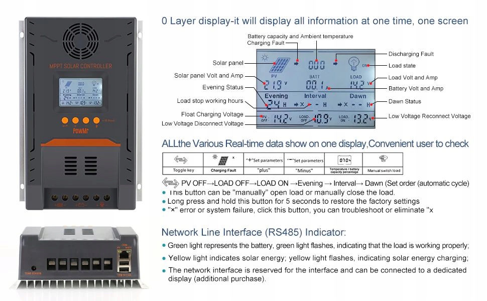 Возможность временной установки включения на определенное время после наступления темноты от 1 часа до 23 часов, или вручную контролировать выход нагрузки до тех пор, пока не будет установлено минимальное напряжение на батареях.