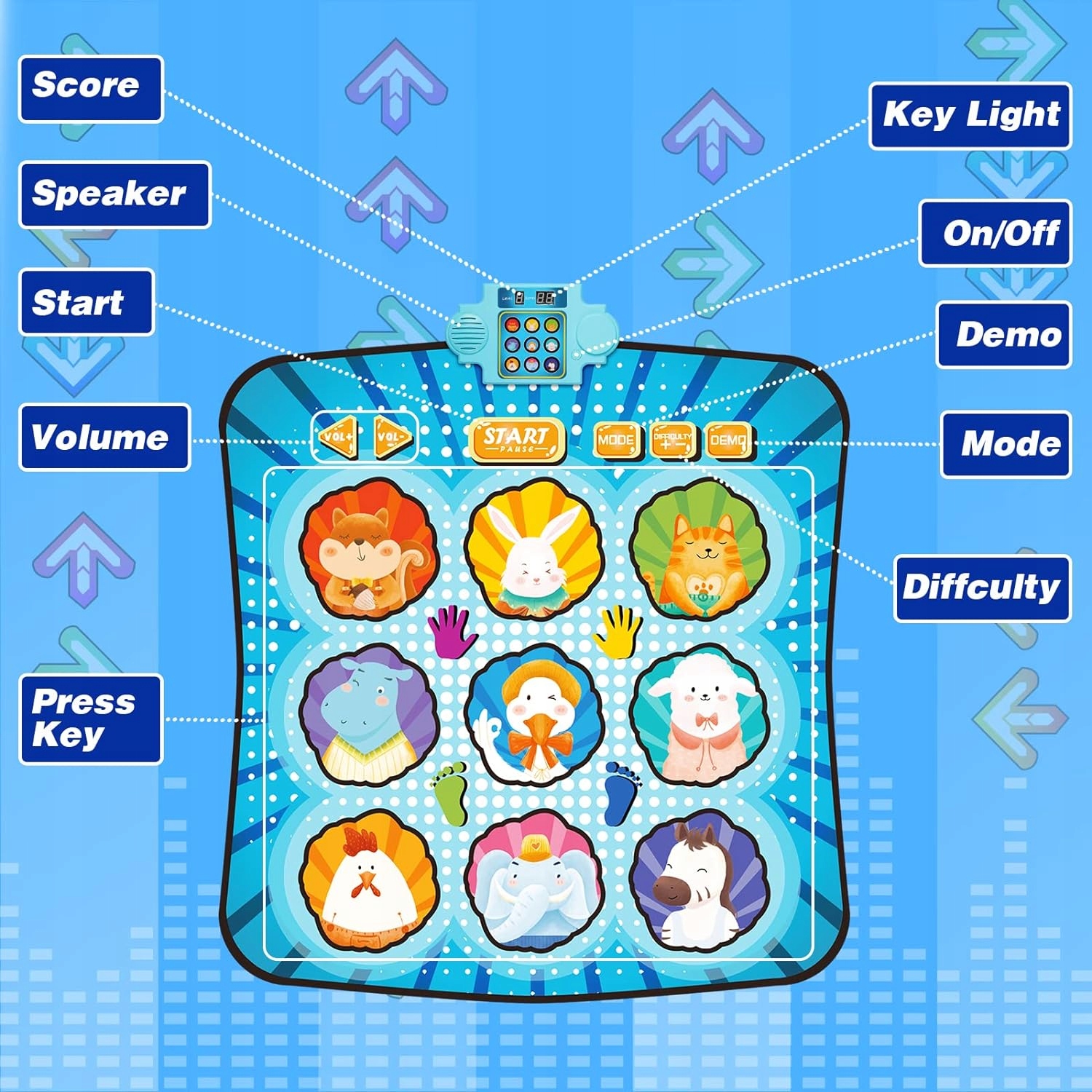 Детский танцевально-музыкальный коврик имеет 8 встроенных музыкальных композиций, 4 режима игры, 8 уровней, 3 уровня сложности, регулируемую громкость. Он не требует подключения к телевизору, прост в использовании, поэтому дети легко смогут весело провести целый день.