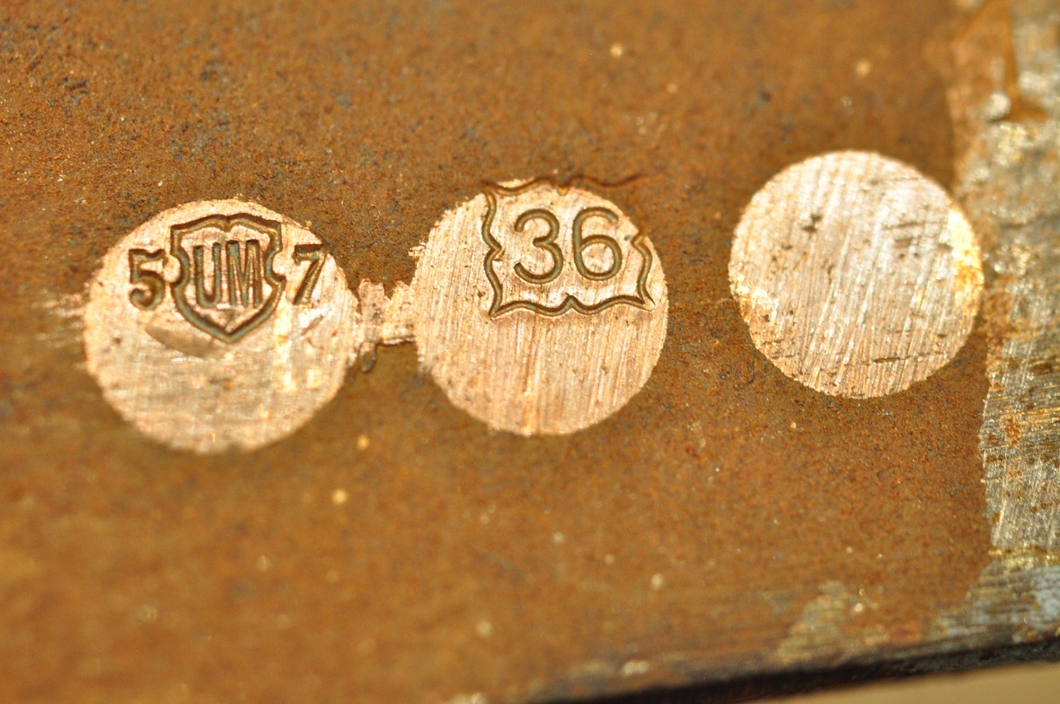 Знаки проверки на основном плече весов (правая сторона) — медные проверочные вставки:
