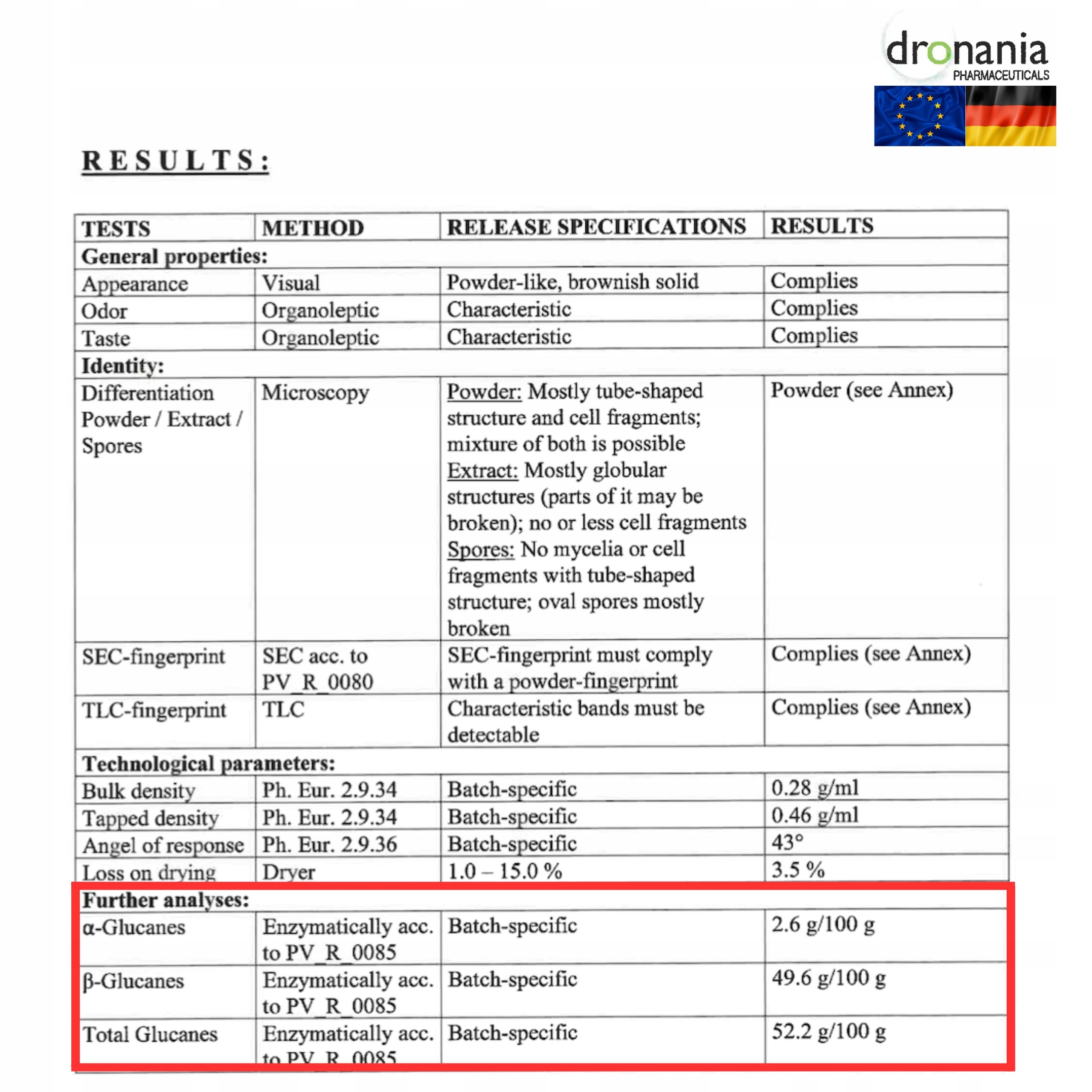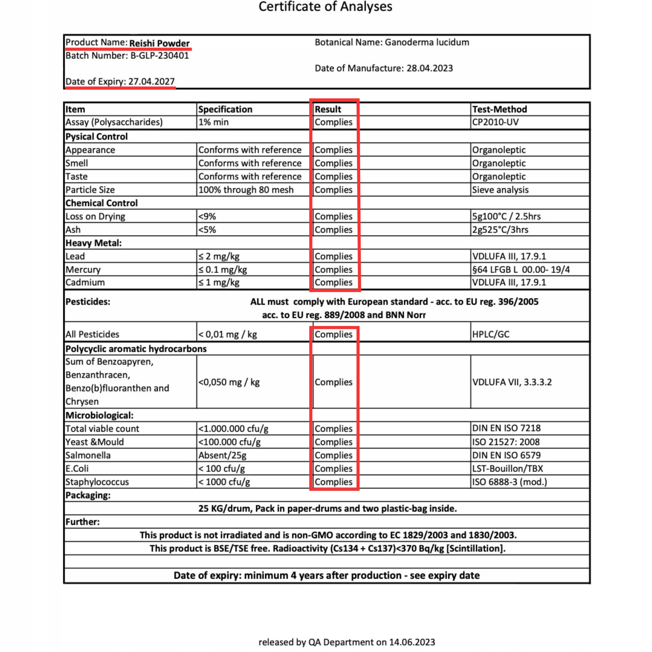 Исследования, проведенные в двух аккредитованных немецких лабораториях agrolab и пинтов фармацевтических препаратов подтверждают безопасность наших сушеных Reishi в виде свободной засухи в капсулах. Анализ был проведен в соответствии с аккредитованным методом, и результаты связаны только с проверенными образцами. Все результаты, представленные в отчете, ниже самых высоких допустимых уровней загрязнения, указанных в Комиссионном положении (ЕС) № 1881/2006 от 19 декабря 2006 года. Это означает, что наш сушеный рейши в виде свободных сушных в капсулах можно безопасно есть.