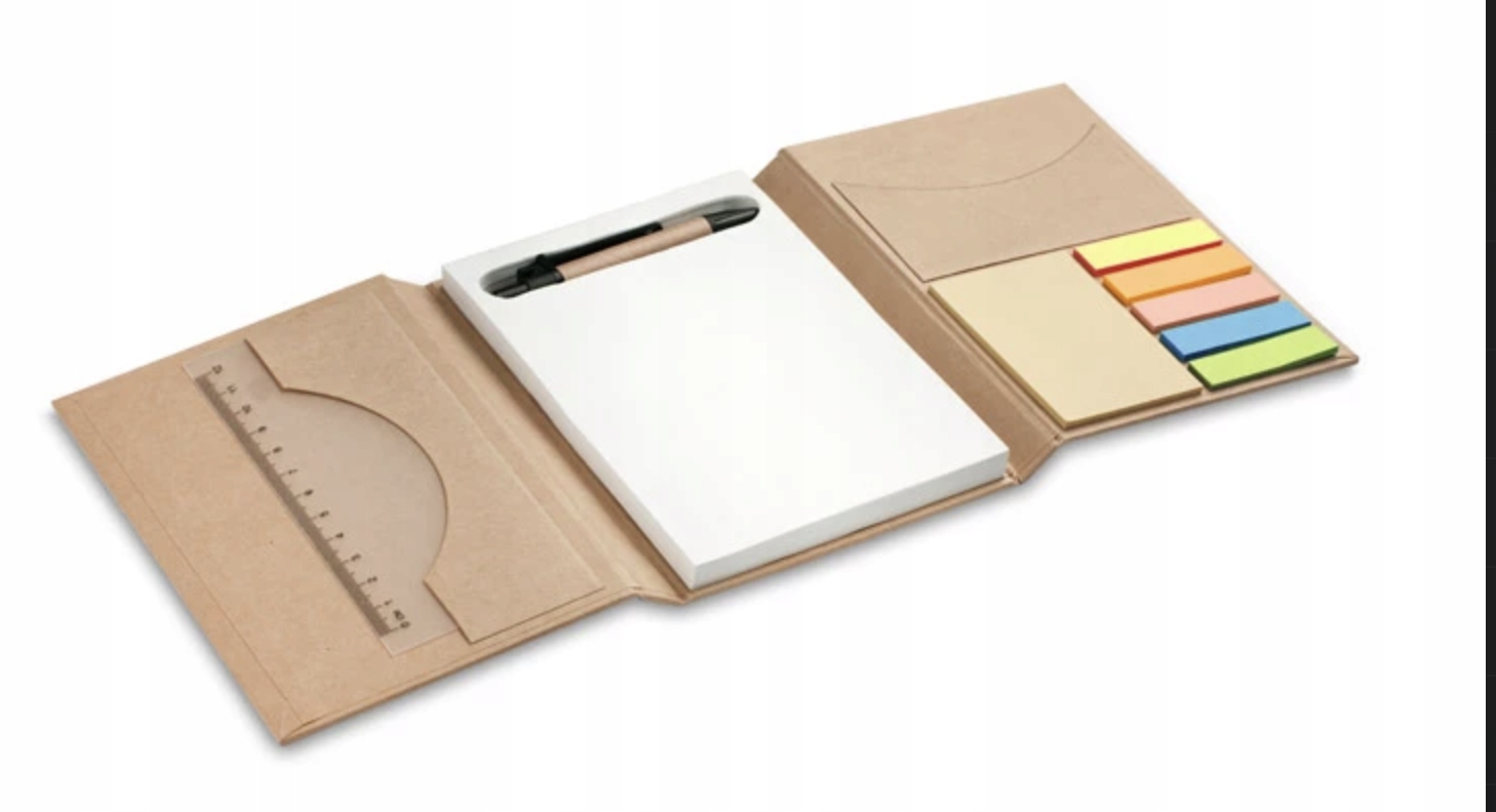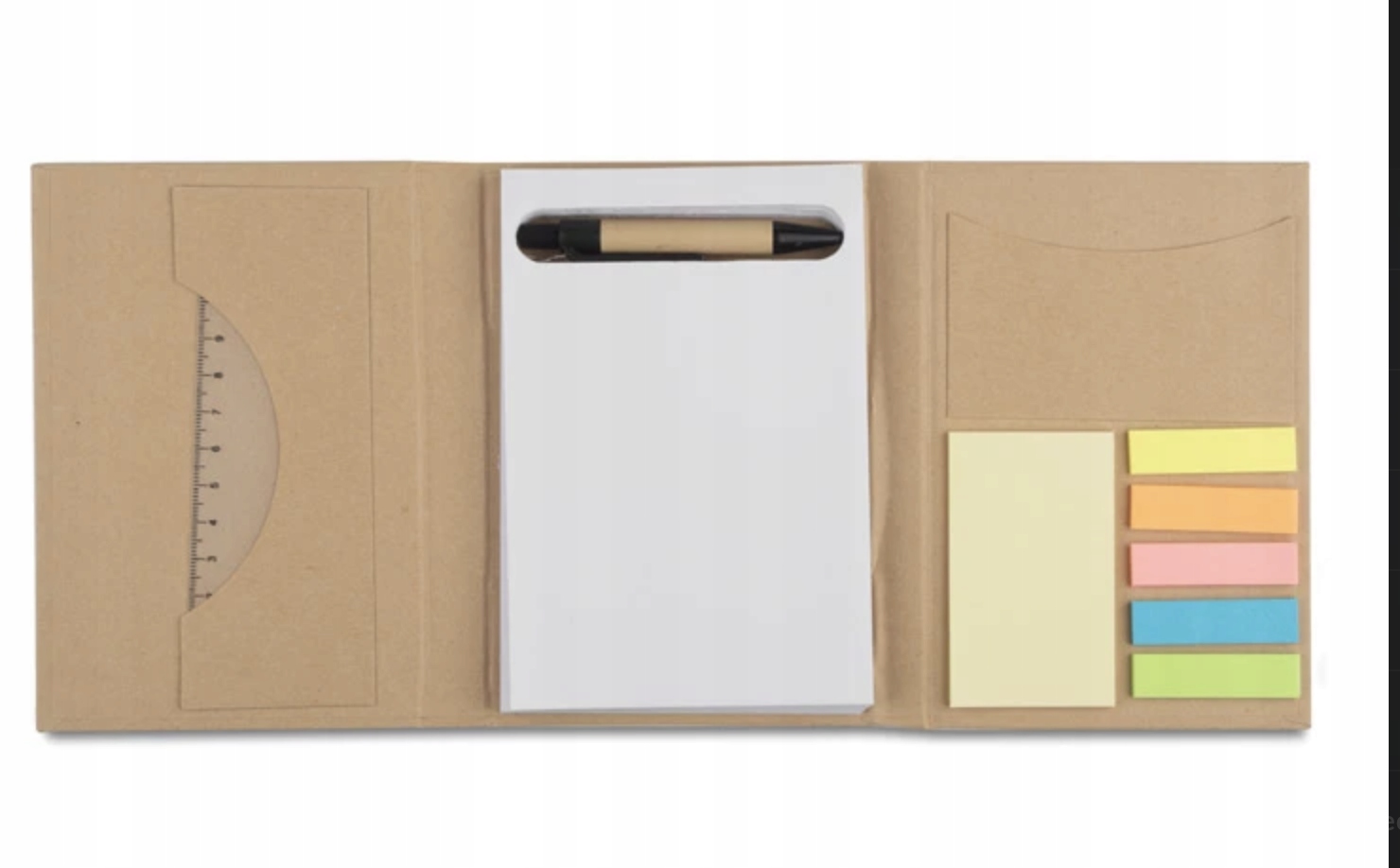 внутри прячется линейка, стикеры, место для визиток и ручки
