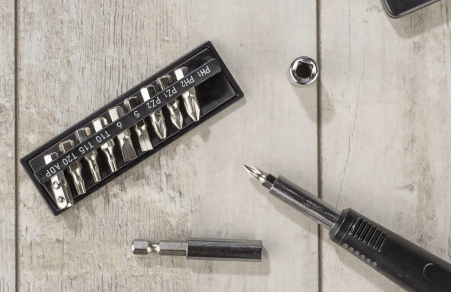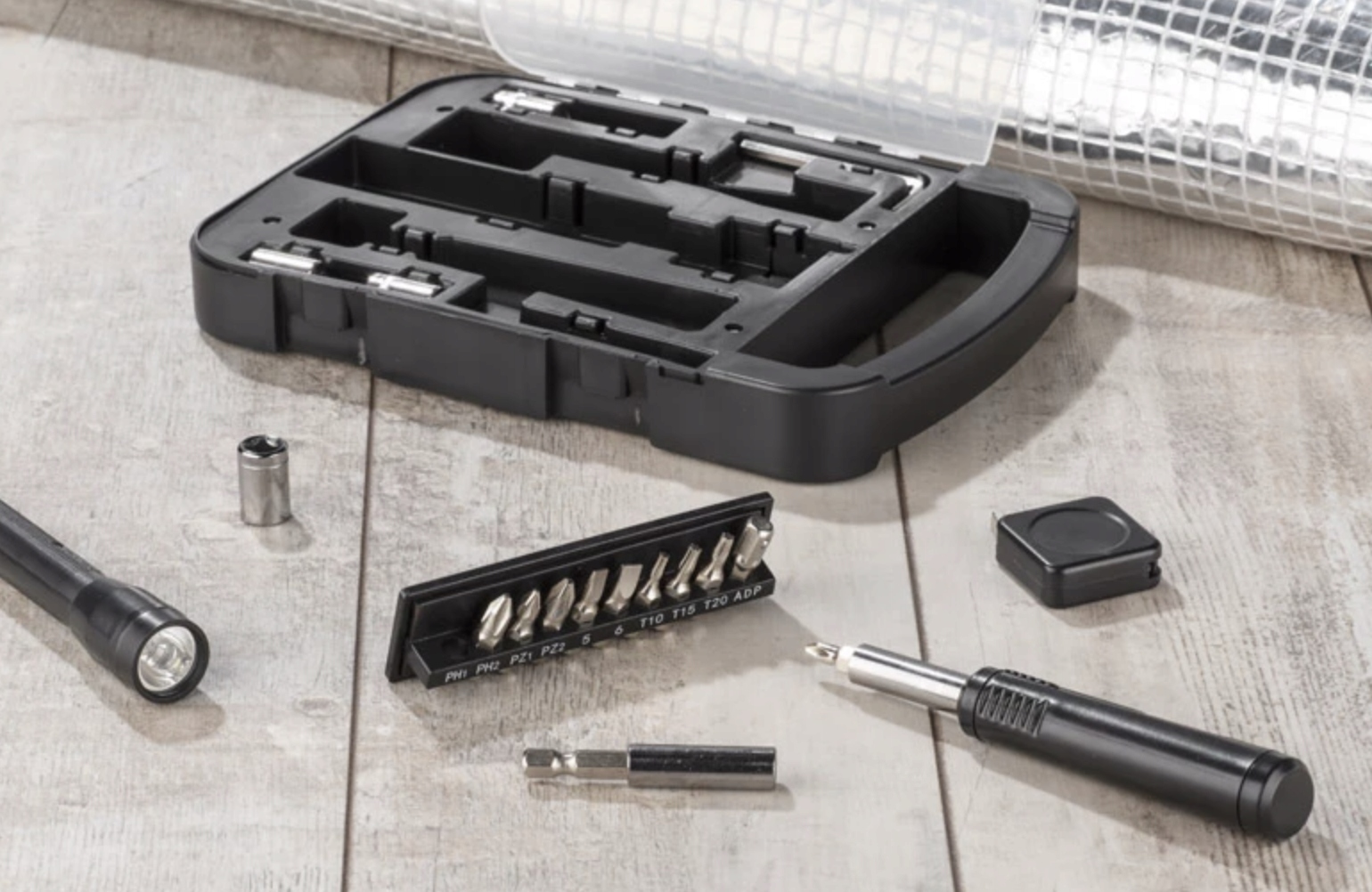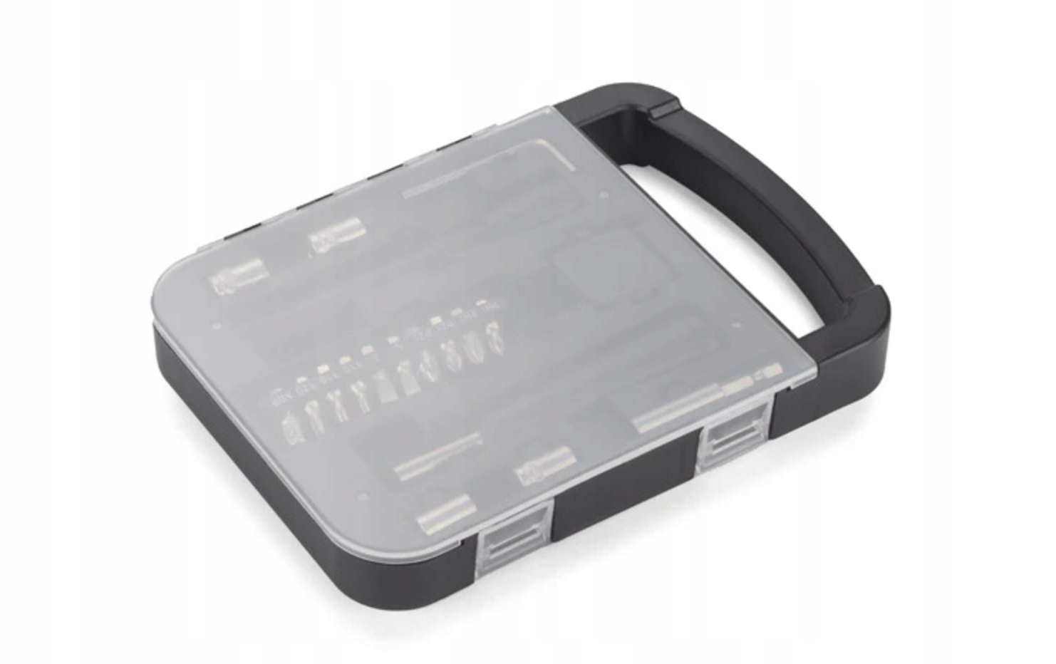 - Дополнительная информация: Внутри находятся: шестигранный ключ, фонарик, рулетка, отвертка, десять разных бит, удлинитель и четыре торцевые биты 7 мм, 8 мм, 9 мм и 10 мм.