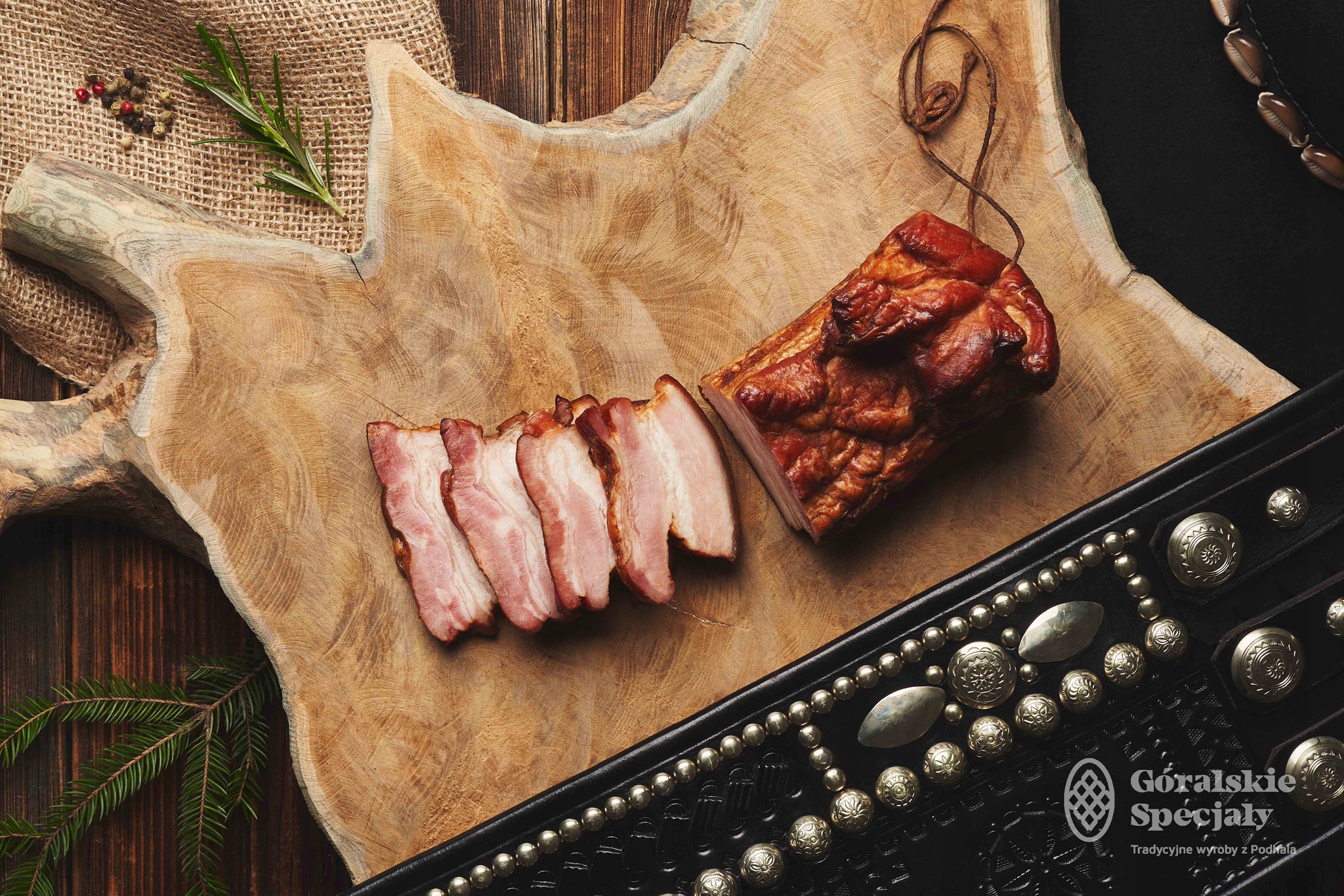 - Ингредиенты: Мясо свинины - бекон, маринованная соль, сахар, натуральные специи (майоран, чеснок, белый перец, кориандр)
