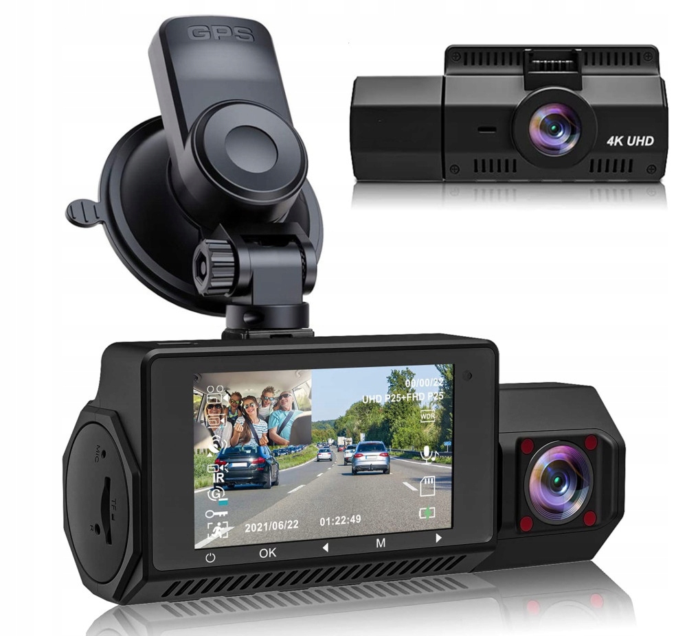 3 камеры спереди, посередине автомобиля, сзади. GPS, Wi-Fi, режим парковки, циклическая запись G-сенсора, инфракрасный порт в камере внутри автомобиля. Запись: с 3-х камер одновременно 4к (2160р) + 2х Full HD (1080р), если только спереди и по центру автомобиля 4к спереди (2160р), центр Full HD (1080р), экран 2,45 дюйма, функциональные клавиши, карта microSD. поддержка 256 ГБ