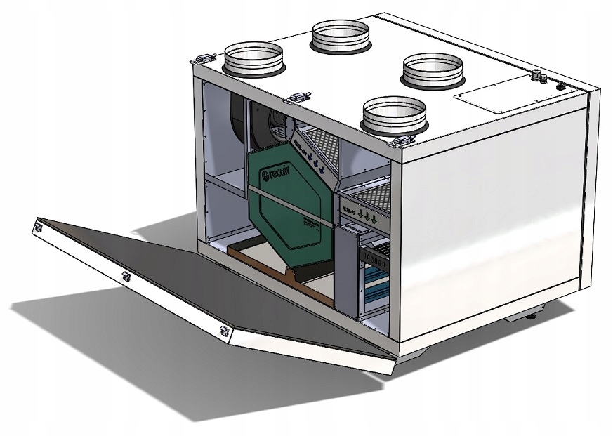<р>1. Вентиляторы: RH19V-4IP.Z8.AR АРЕНДА 190 VPRO С ДВИГАТЕЛЕМ EC055. 170 Вт. 1,75-1,45А. <р>2. Теплообменник перекрестноточного противоточного исполнения: РЭК+17-240-22. <р>3. Створки, открывающиеся как спереди, так и сзади. <р>4. Соединения Ø125мм. с возможностью подключения к системе в горизонтальном или вертикальном исполнении. <р>5. Ножки регулируются по высоте. <р>6. Предпусковой подогреватель (М – 500Вт). <р>7. Высококачественные фильтры:Черпня – F7